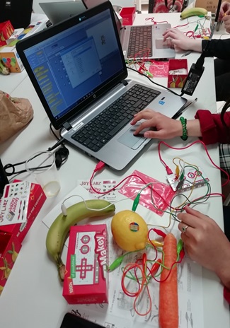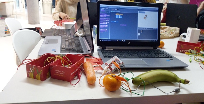 Le premier atelier proposait le coding d'un jingle de musique via l'application Scratch, la carte Makey Makey et en utilisant des fruits et légumes !