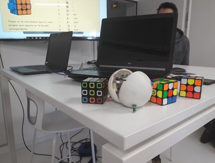L'ISEN a présenté son Rubik's Cube connecté. Grace au machine-learning ou capacité à apprendre (une des disciplines de l'Intelligence Artificielle) et à l'IoT (objets connectés), le cube est capable de reconnaître la personne qui le manipule. Il peut ensuite être utilisé comme manette pour des jeux.