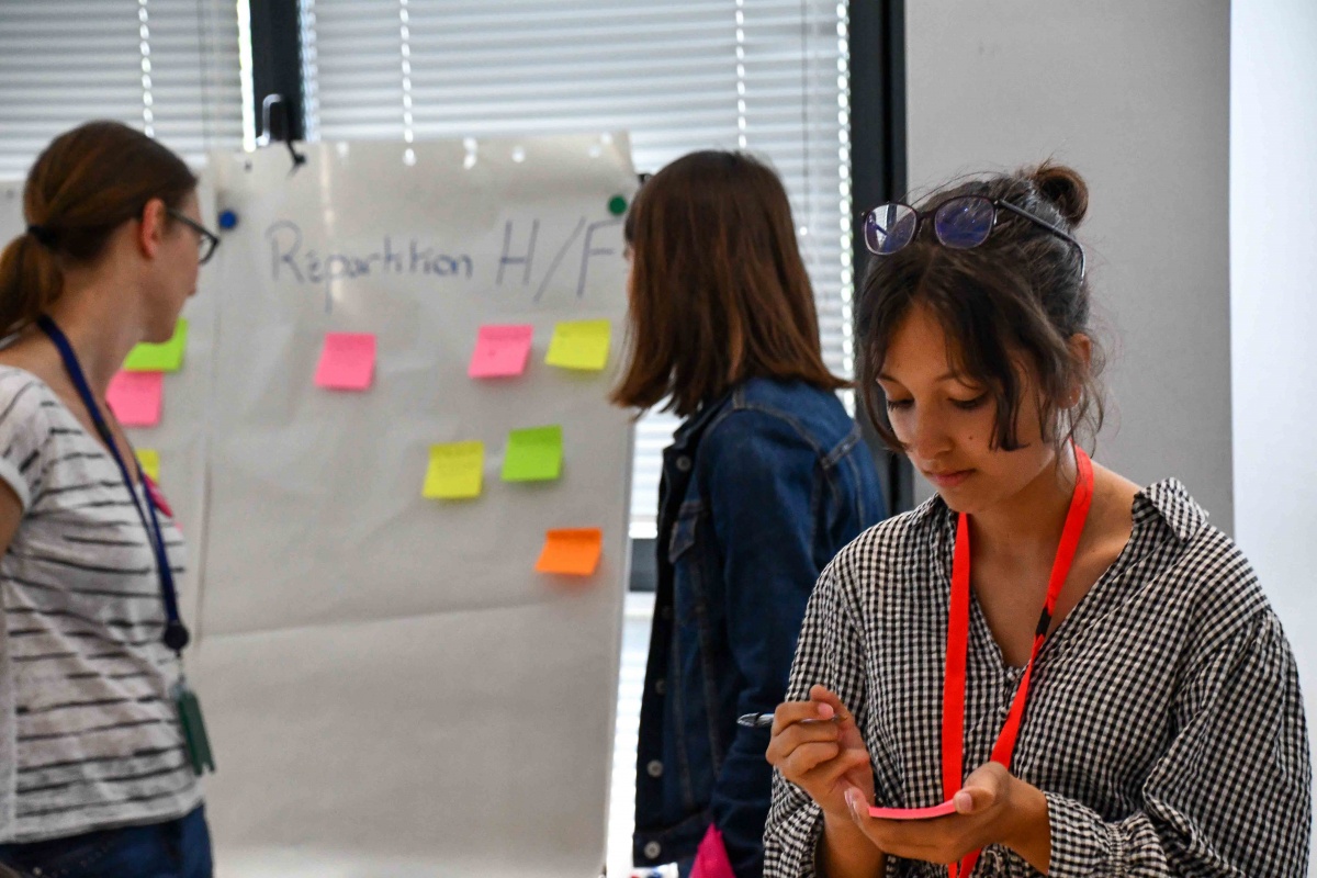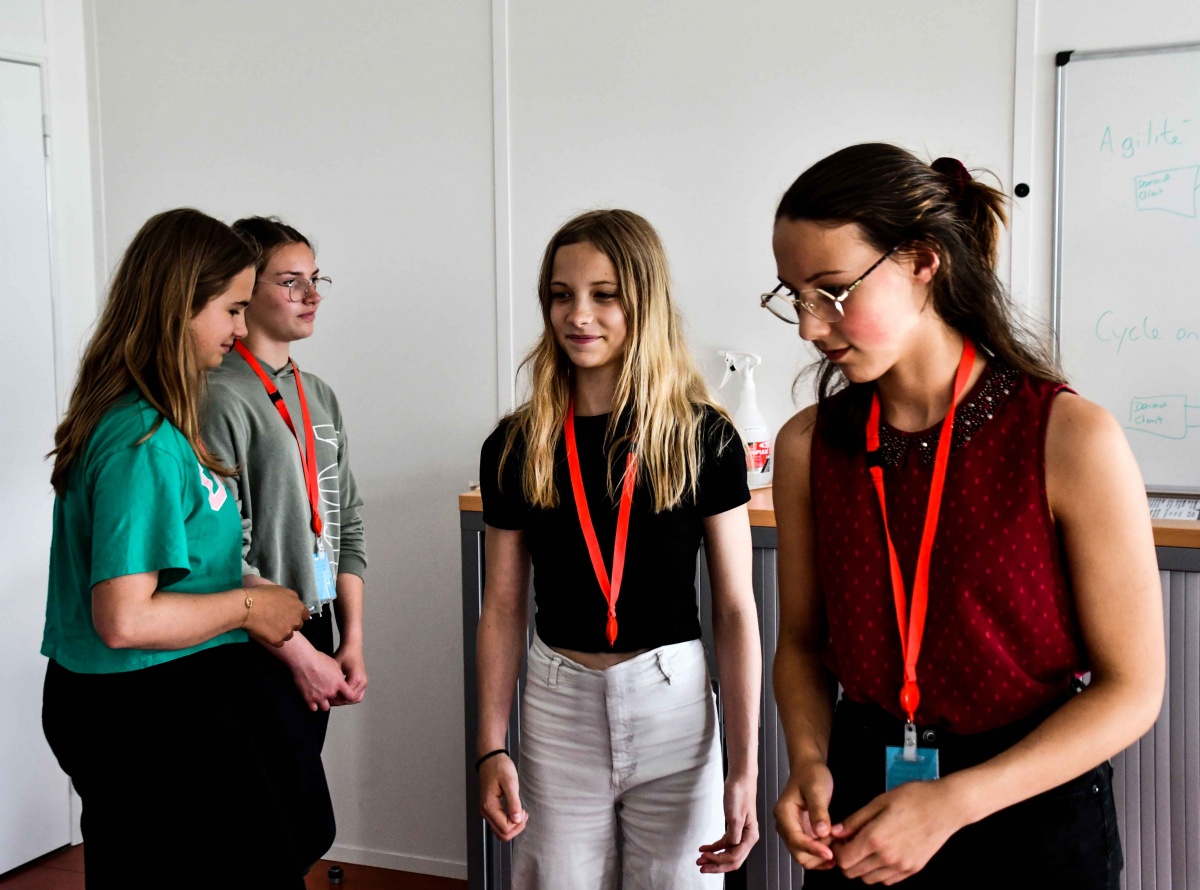 Hélène (responsable qualité), Sophie (responsable gestion de configuration), Manon (jeune diplômée, ingénieure développement) et Julie (apprentie ingénieure) ont fait réflechir nos groupes, sur ce qu'est un.e ingénieur.e :