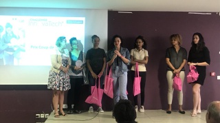 L'ÉQUIPE ROSE POUR LE PROJET « RFC : Rideau Filtrant Connecté »Equipe composée de Lola et Shana du lycée La Jetée François, des étudiantes Jessika et Aurélie de la prépa Joseph Gaillard, ainsi que Lyndsay (EDF) et Edwige (Banamart) – Ville Durable