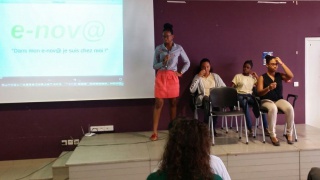 L'ÉQUIPE VERTE POUR LE PROJET « e-Nov@ »Equipe composée d'Anaïs et Euriell du lycée Joseph Gaillard, de Natalie et Olivia de la prépa Ducos, ainsi qu'Aline et Géraldine (EDF) - Transports de demain
