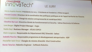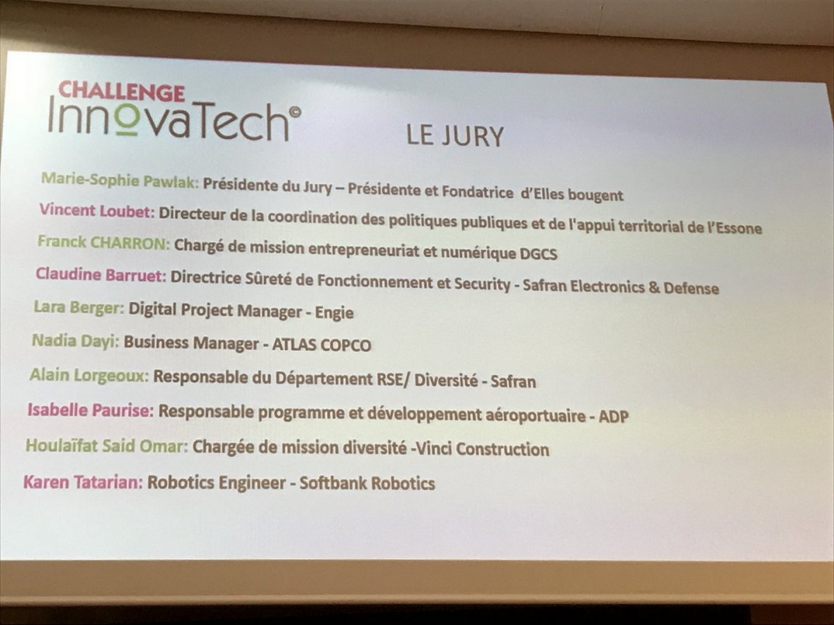 Le jury, composé de Marie-Sophie Pawlak, Présidente du Jury, Présidente et Fondatrice d'Elles bougent, Vincent Loubet, Directeur de la coordination des politiques publiques et de l'appui territorial de l'Essonne, Franck Charron, Chargé de mission entrepreneuriat et numérique à la DGCS, Claudine Barruet, Déléguée régionale Elles Bougent en Ile-de-France et Directrice Sûreté de Fonctionnement et Security chez Safran Electronics & Defense, Lara Berger, Digital Project Manager chez Engie, Nadia Dayi, Business Manager à ATLAS COPCO, Isabelle Paurise, Responsable programme et développement aéroportuaire au sein du Groupe ADP, Houlaïfat Said Omar, Chargée de mission diversité au Groupe Vinci, et Karen Tatarian, Robotics Engineer chez Softbank Robotics, s'installe et se prépare pour découvrir les projets.