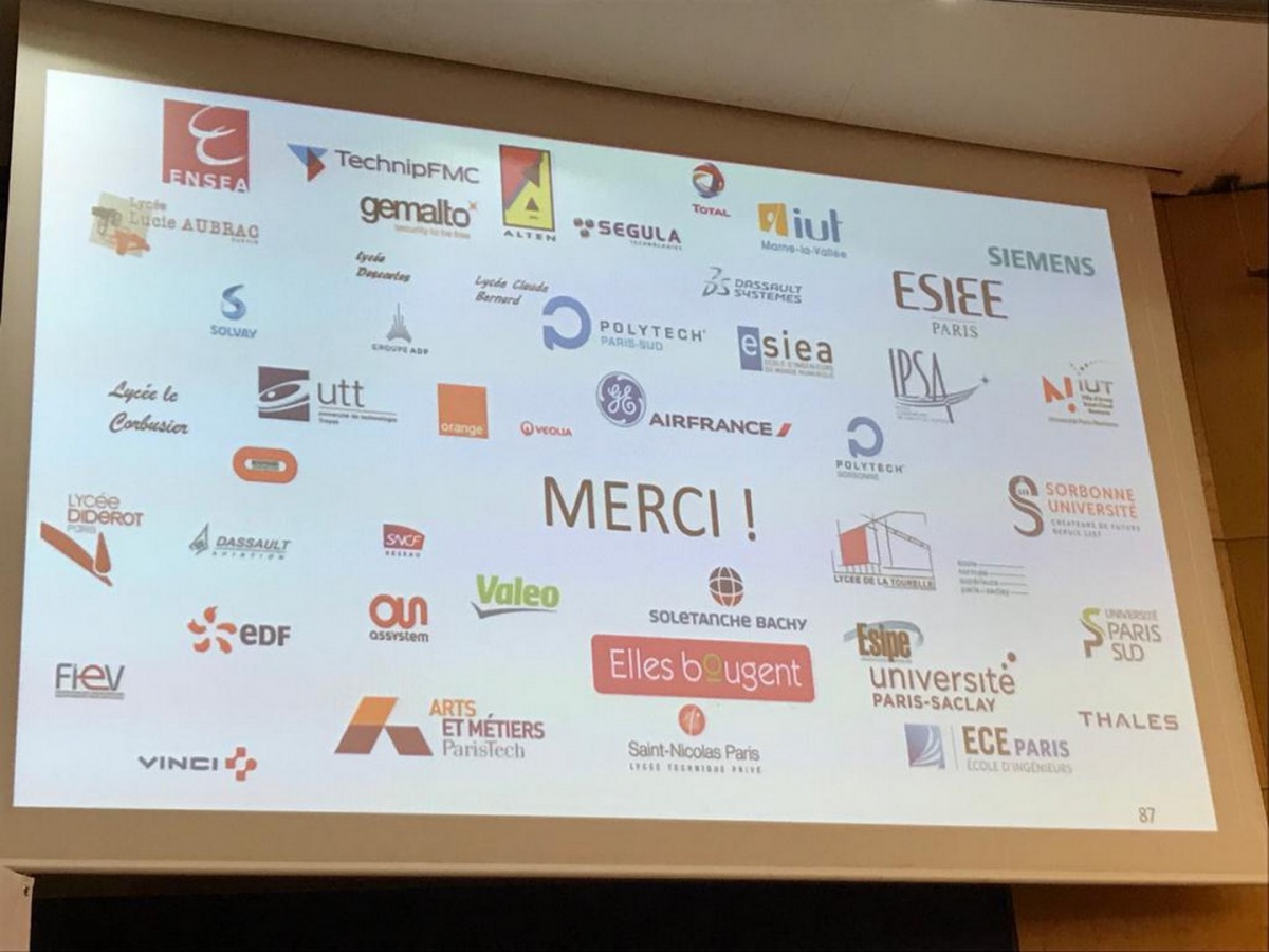 Un grand MERCI également aux participantes : les lycéennes du LGT Saint Nicolas, du Lycée Le Corbusier, du Lycée de tourelle, du Lycée Diderot, du lycée Claude Bernard et du Lycée René Descartes ; les étudiantes de l'ECE PARIS, de l'ENS, de l'ENSEA, de l'ESIEE Paris, de l'IPSA, de l'IUT Marne la vallée, de l'IUT Ville d'Avray, de Polytech Sorbonne, de l'Université Sorbonne et de l'Université Paris Saclay ; et les marraines des entreprises Air France, Alten, Assystem, Bouygues Construction, Dassault Aviation, Dassault Systèmes, EDF, la FIEV, GE, Gemalto, Groupe ADP, Orange, Safran, Segula Technologies, Siemens, SNCF, Solentanche Bachy, Solvay, Sopra Steria, Technip FMC, Thales, Total et Veolia.