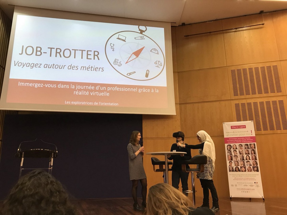 Le concept : Créer une application qui a pour but d'aider les étudiantes dans leur orientation professionnelle. Cette application permet de découvrir le quotidien de professionnels de différents secteurs à travers un casque de réalité virtuelle. Les membres de l'équipe sont ou vont passer par cette étape, qui est de choisir sa carrière professionnelle et estiment qu'il n'est pas aisé de s'orienter sans une véritable immersion. Le casque de réalité virtuelle permettra de faciliter l'orientation mais également de faire découvrir de nouveaux métiers.