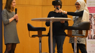 Claudine Barruet remercie Manon, Athenaïs et Fatoumata, élèves du Lycée René Descartes, ainsi que les marraines Camille (Sopra Steria) et Pauline (Gemalto), pour leur participation. Elles repartent avec des écouteurs en cadeau.