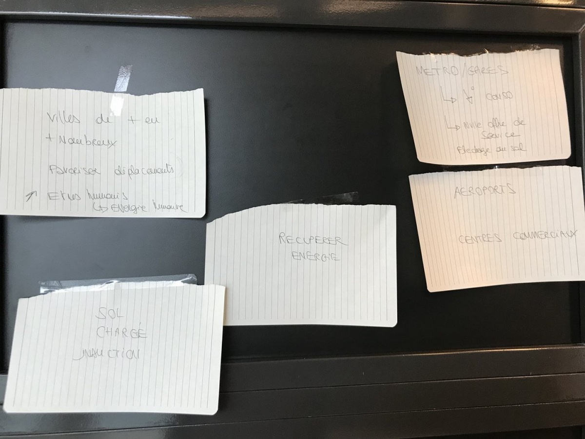 Le concept : Utilisation de l'énergie produite par le mouvement de l'homme. Il s'agit de trouver de nouvelles sources d'énergie pour améliorer notre rendement énergétique, avec l'augmentation de la densité de la population en ville et des déplacements en transport en commun. Comment les rentabiliser énergétiquement ? La cible du projet est les gares, dans un premier temps, avec la création d'un sol à induction couplé à un système de batterie permettant de stocker et d'alimenter un système électrique. Avec des matériaux flexibles, l'infrastructure sera moins lourde, facilement modulable, transformable, comme un « film ».