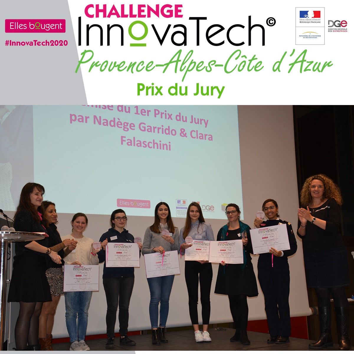 Nous remercions chaleureusement l'ensemble des partenaires mobilisés pour la réussite du challenge InnovaTech 2020 en région Provence-Alpes-Côte d'Azur : le Palais des Congrès de Saint-Raphaël pour son accueil et en particulier Clara Falaschini et Léa Causse, co-organisatrices du challenge, la délégation régionale Elles Bougent Provence-Alpes-Côte d'Azur et ses délégués Stéphanie, Fatima et Clara, la Mairie de Saint-Raphaël, la Mairie de Fréjus, la Fabrique de l'industrie ainsi que les membres du jury.