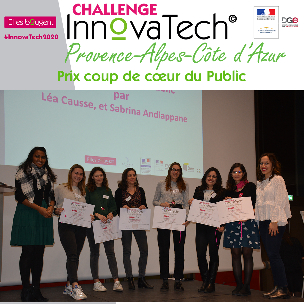 Le Challenge InnovaTech©2020 est un événement organisé sous le haut patronage du Ministère de l'Économie et des Finances, en partenariat avec la Direction Générale des Entreprises ,et avec le soutien du Secrétariat d'État chargé de l'Égalité entre les femmes et les hommes et de la lutte contre les discriminations, de la Direction Générale de la Cohésion Sociale et de La Fabrique de l'Industrie.