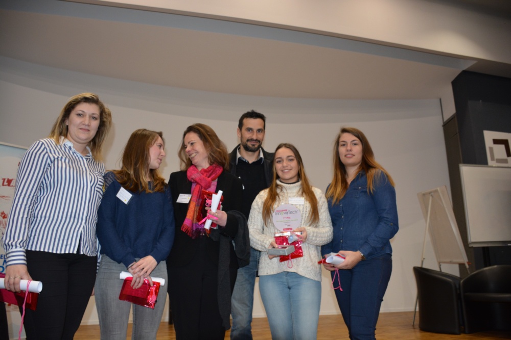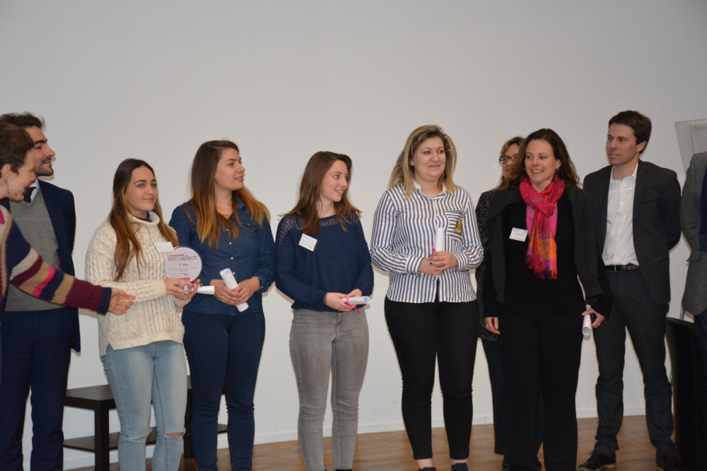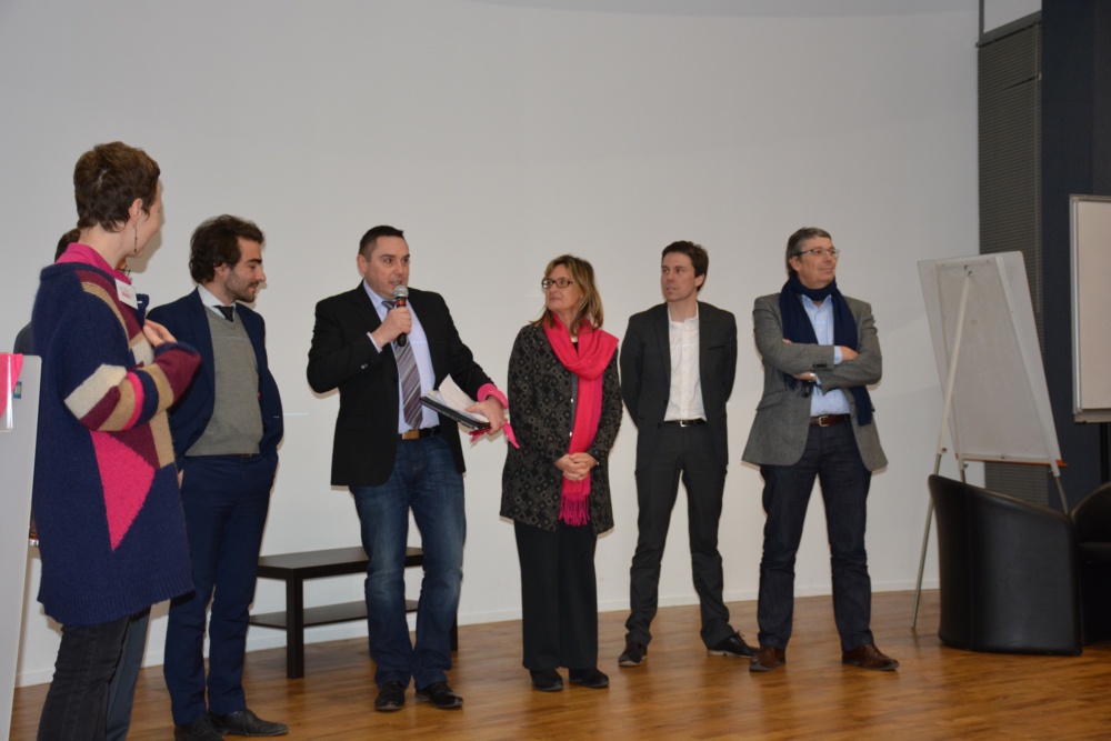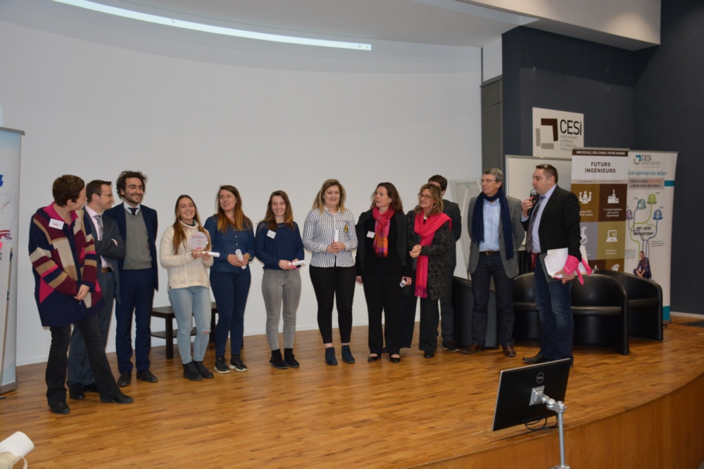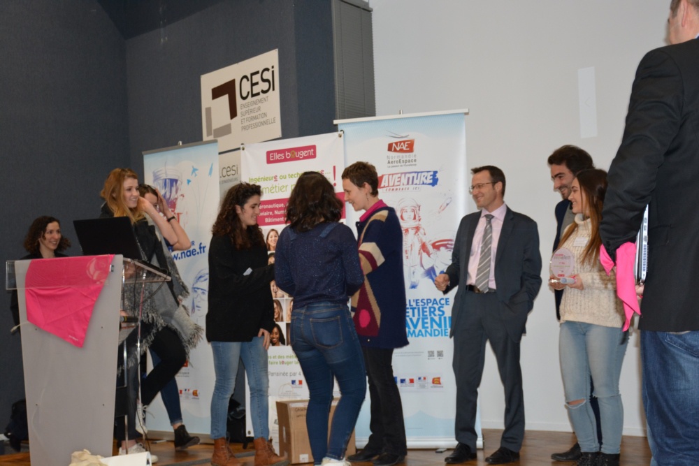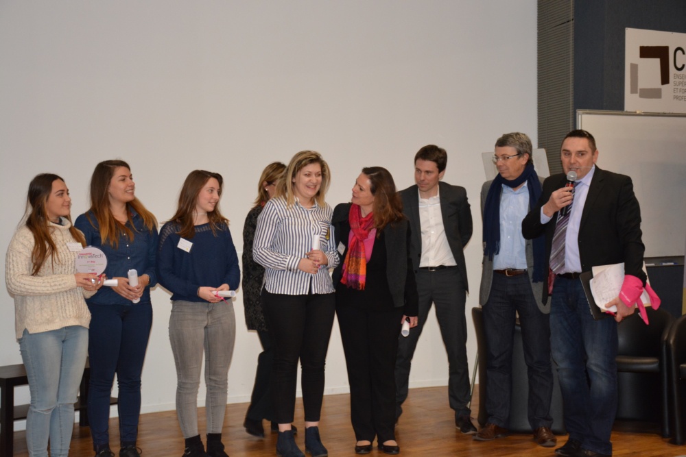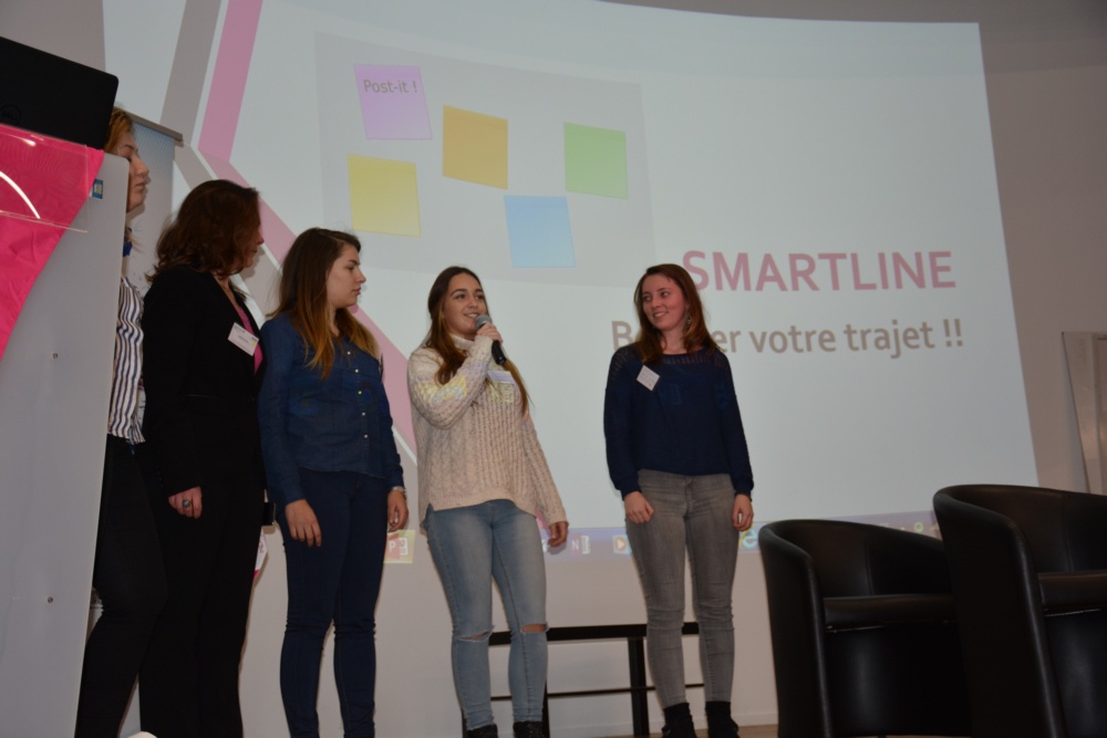 Le prix du jury a été remis à l'équipe jaune pour son projet « SmartLine / booster votre trajet », dans la catégorie des objets connectés, par Christine Dispa Directrice du CESI et Sylvain Borde Chargé de mission Développement économique à la DIRECCTE. Pour tout savoir sur cette application conçue par Catherine, Laurine, Sofia, Marie et Alexia, rendez-vous au Ministère de l'Economie et des Finances, le 21 mars, lors de la Semaine de l'industrie.