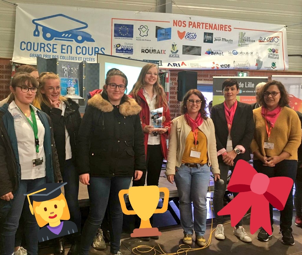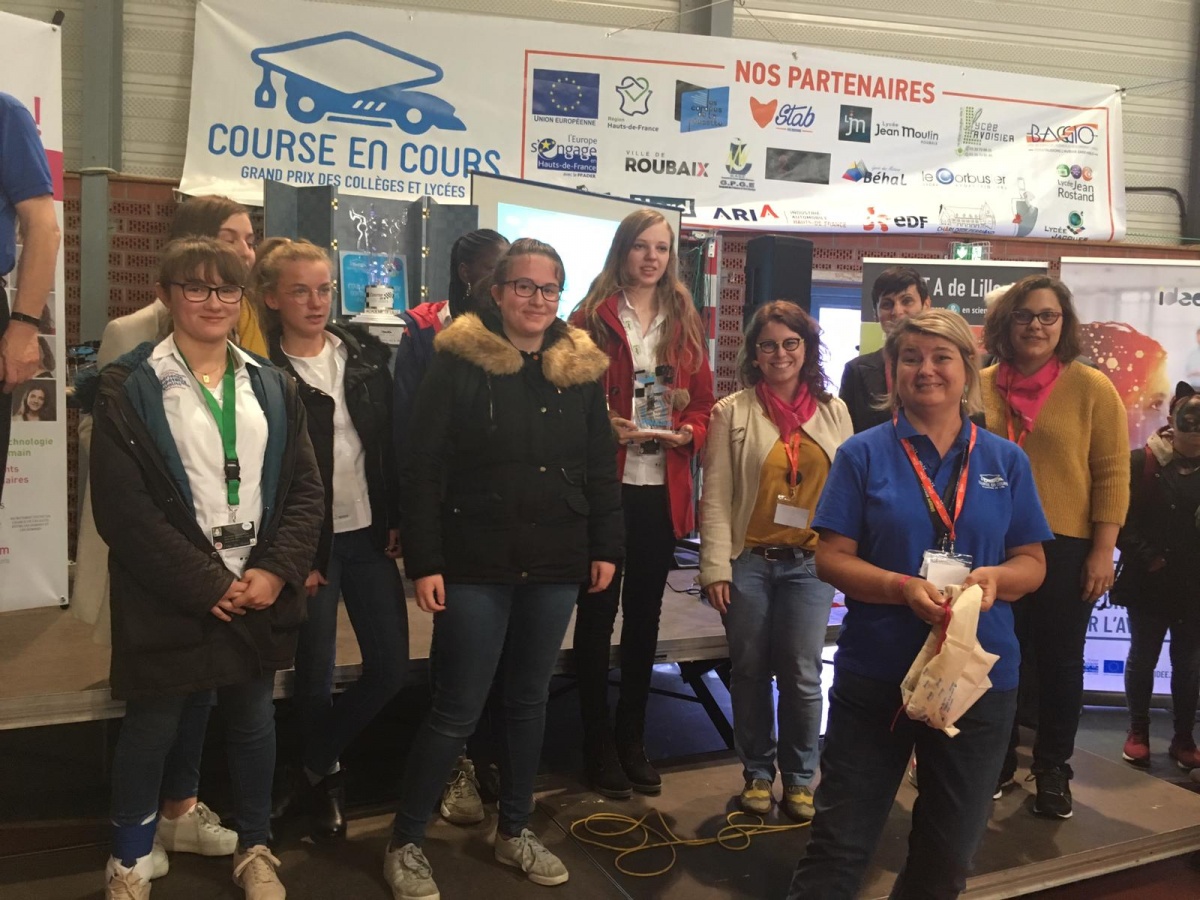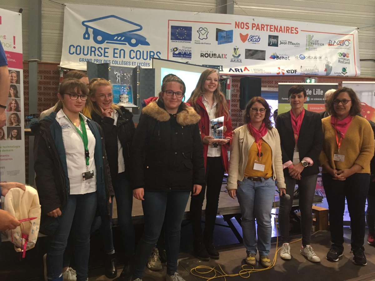 Le prix Elles bougent a été remis par les marraines Elles Bougent à l'équipe « TEAM COOKIES » du Collège Jean Rostand - Le Cateau Cambrésis. Ce prix récompense les équipes composées à 50% de filles. « Elles Bougent » et « Course en cours » sont partenaires pour soutenir une démarche commune : faire tomber les clichés sur le secteur industriel et attirer davantage de femmes vers les métiers scientifiques et techniques.