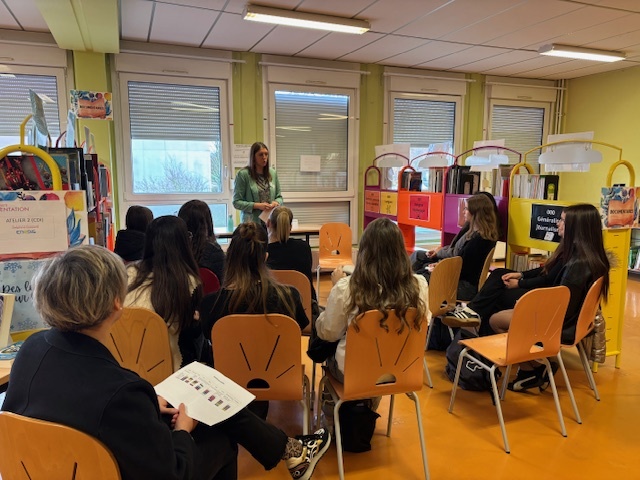 A l'issue de la plénière, les élèves se sont dirigées en groupe vers les différents ateliers pour échanger avec les marraines : il y avait 8 ateliers (Andra, Véolia, Vinci, Safran, Enédis, 2 enseignantes du lycée ayant une formation ingénieure et ayant travaillé comme ingénieure, un groupe de lycéennes de terminales suivant des enseignements de spécialité et un atelier orientation animé par les documentalistes du collège et du lycée) Manon a géré la circulation , les photos ...