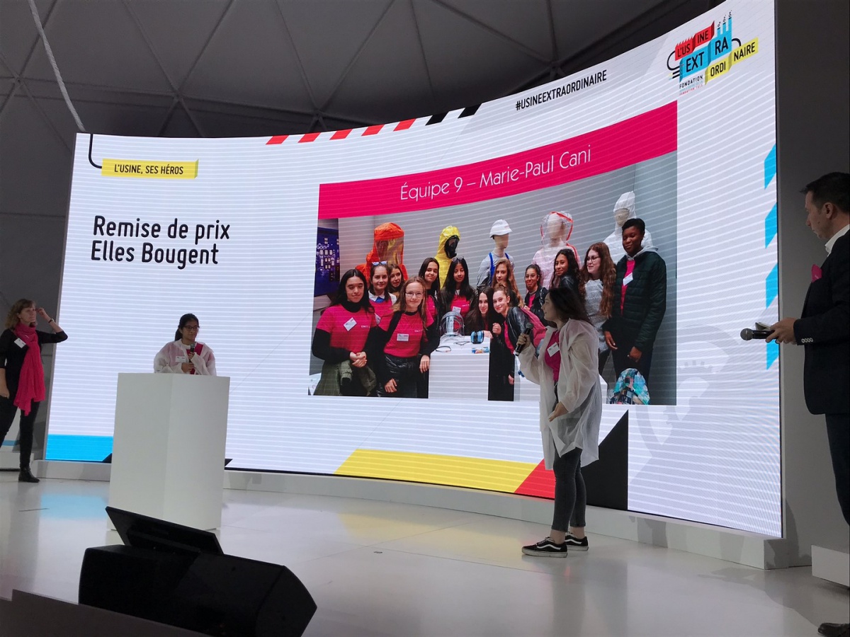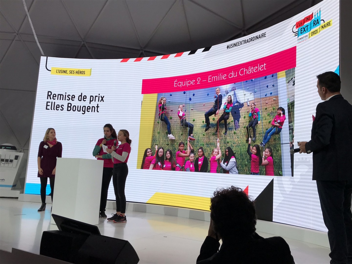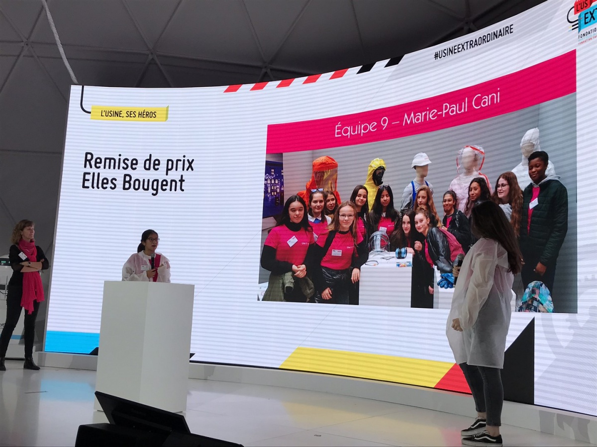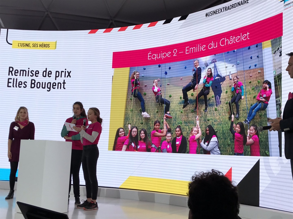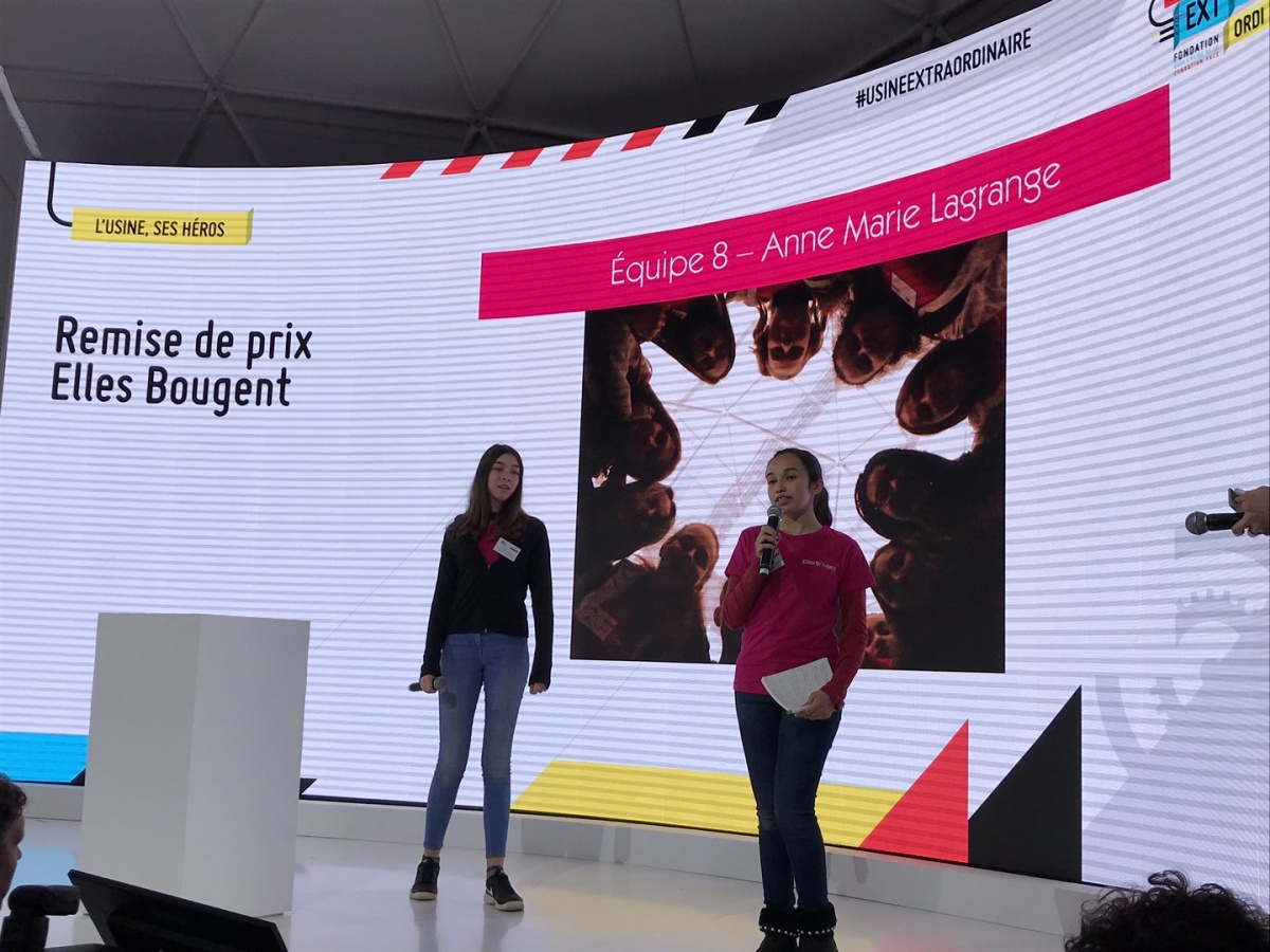 Après les visites, les filles ont défendu chacune à leur tour, sur la scène du Dôme « Partager », leur photo extraordinaire, pour exprimer en quoi leur vision de l'industrie a changé grâce à leur visite de l'Usine extraordinaire.