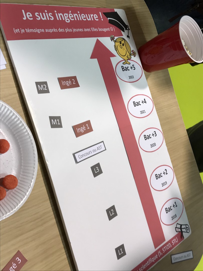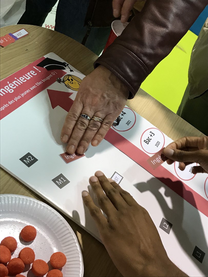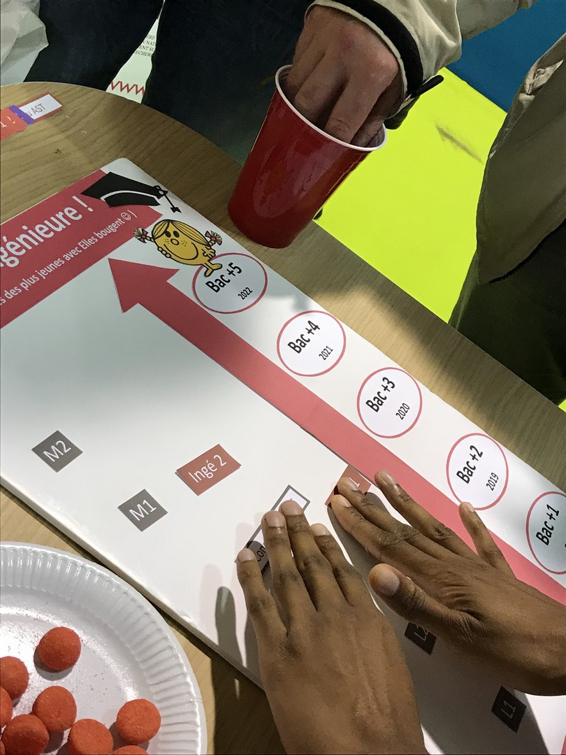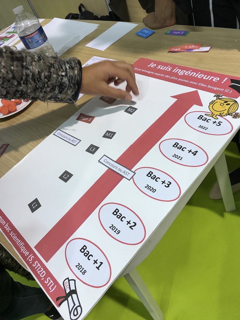 Les marraines et marraines étudiantes Elles bougent se sont relayées toute la journée pour répondre aux questions des jeunes filles et leurs parents. Les plus curieuses se sont essayées au jeu "Comment devenir ingénieure ?" pour découvrir les nombreux chemins qui mènent au métier d'ingénieure.