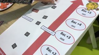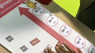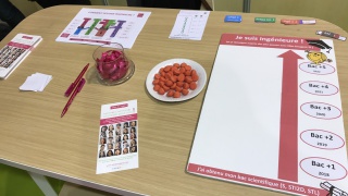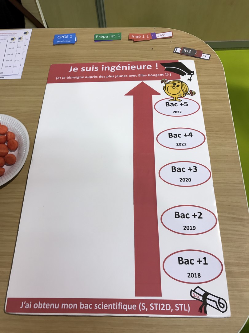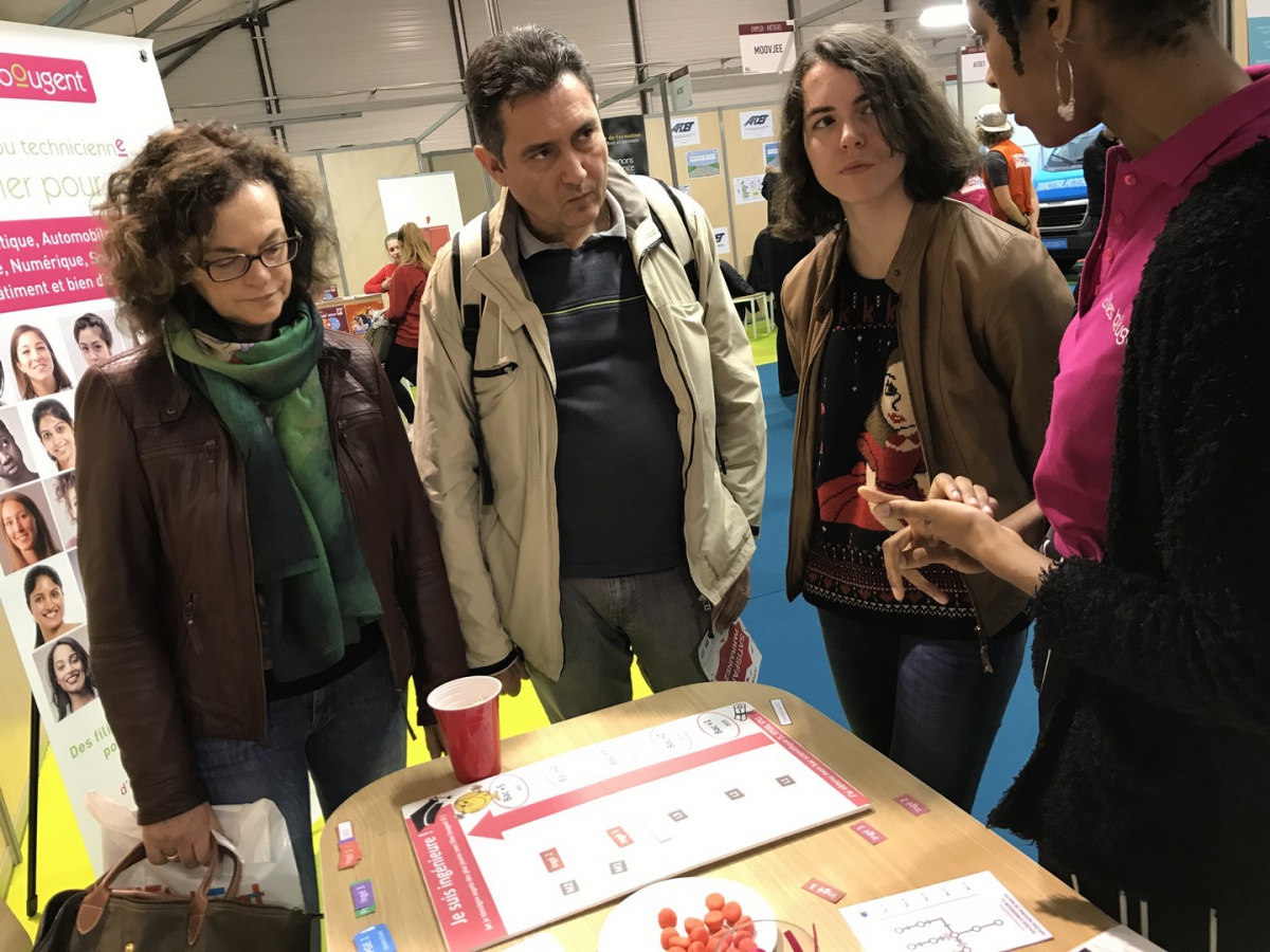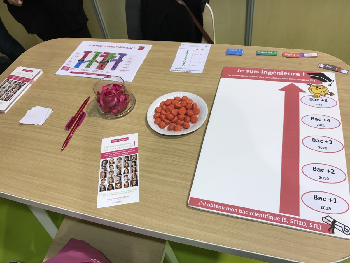 Les marraines et marraines étudiantes Elles bougent se sont relayées toute la journée pour répondre aux questions des jeunes filles et leurs parents. Les plus curieuses se sont essayées au jeu "Comment devenir ingénieure ?" pour découvrir les nombreux chemins qui mènent au métier d'ingénieure.