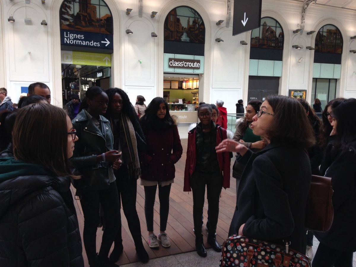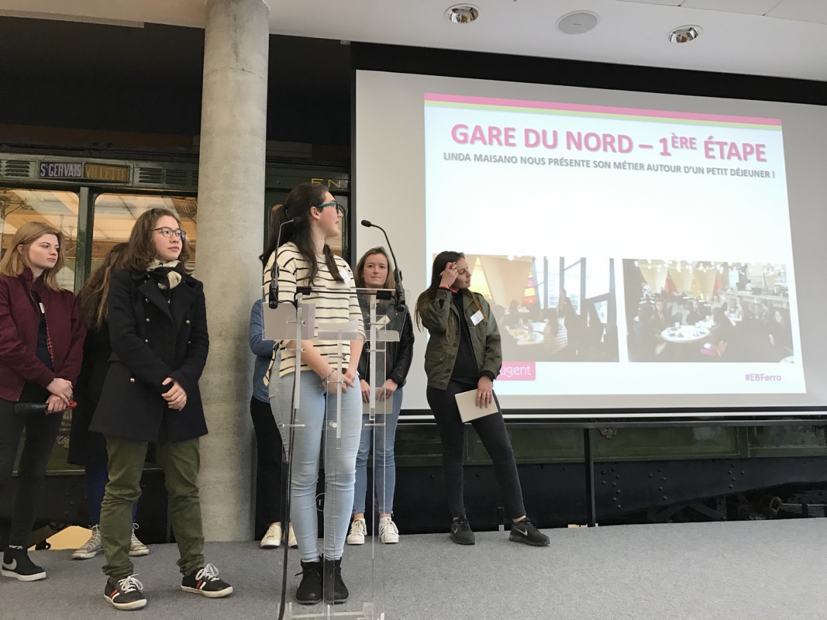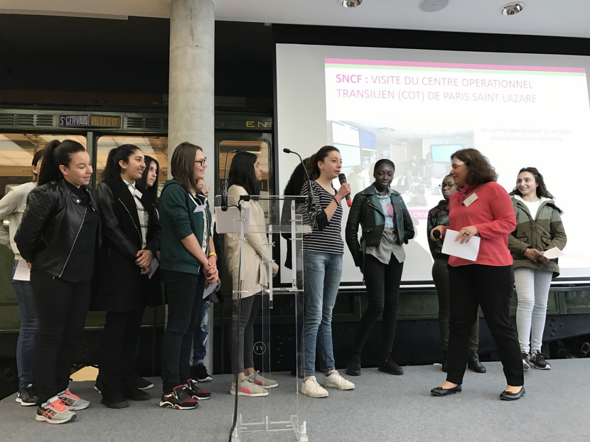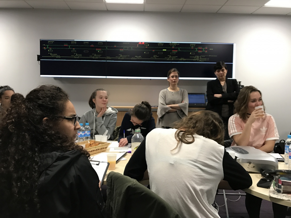 La matinée a débuté par un petit déjeuner avec Linda Maisano, Directrice de l'Établissement d'Exploitation voyageurs de Paris Nord - SNCF. Première femme à occuper ce poste, elle manage 500 personnes et la Gare du Nord est la première gare d'Europe en termes de fréquentation. Elle fait également partie des premières marraines de l'association, lors de sa création, il y a 10 ans. En tant que marraine, elle a expliqué son travail aux élèves de 1ère S du Lycée Saint Nicolas (6ème) et leur a prodigué de nombreux conseils, aux côtés d'une marraine-étudiante de l'ESTACA. Les lycéennes ont ensuite pu visiter la Gare du Nord et son poste de commande, véritable tour de contrôle de la gare. Puis, direction Saint-Denis, en RER, pour découvrir le Technicentre du Landy, où tous les trains de la gare du Nord - Thalys et Eurostar compris - sont entretenus et réparés.