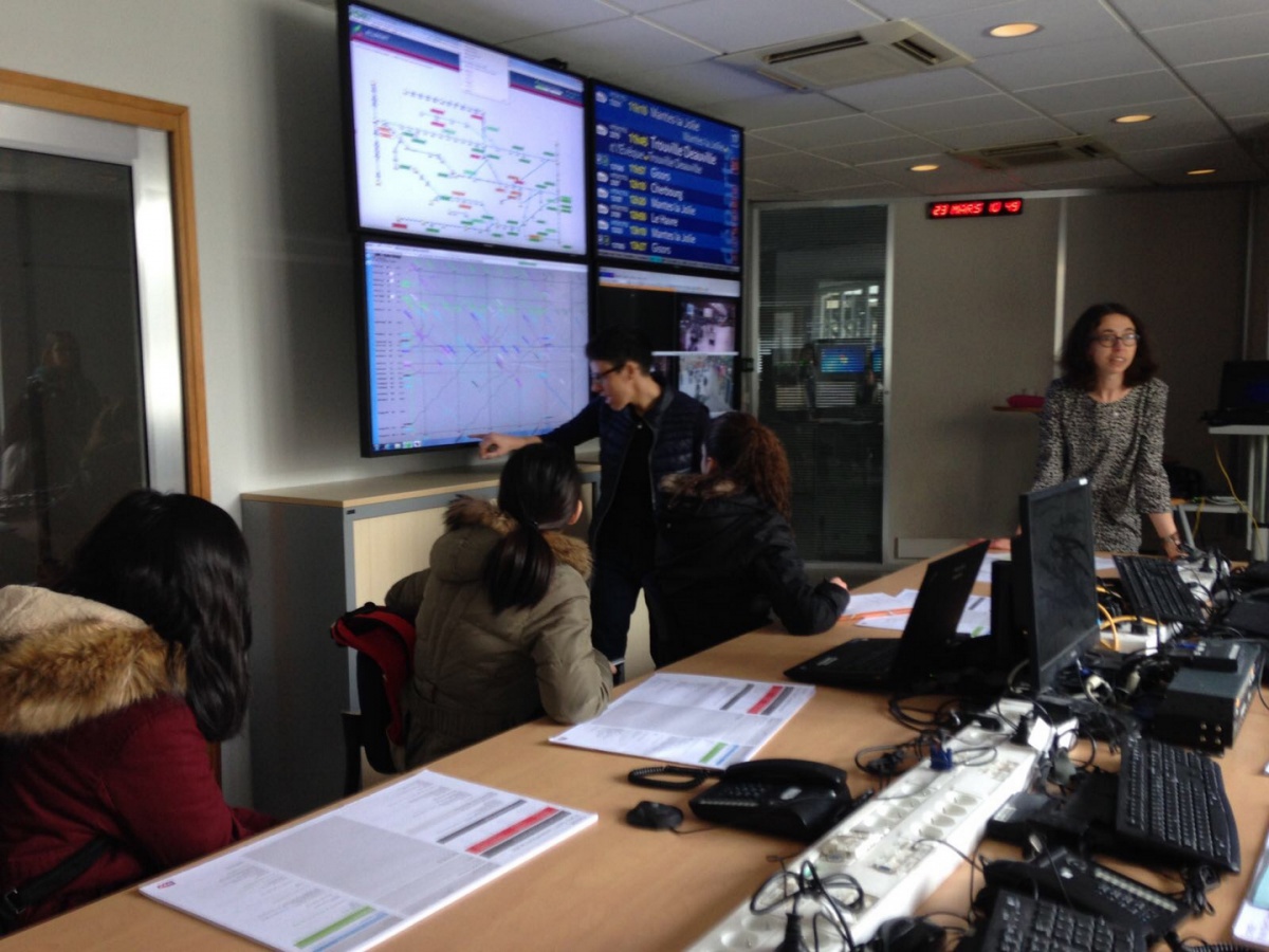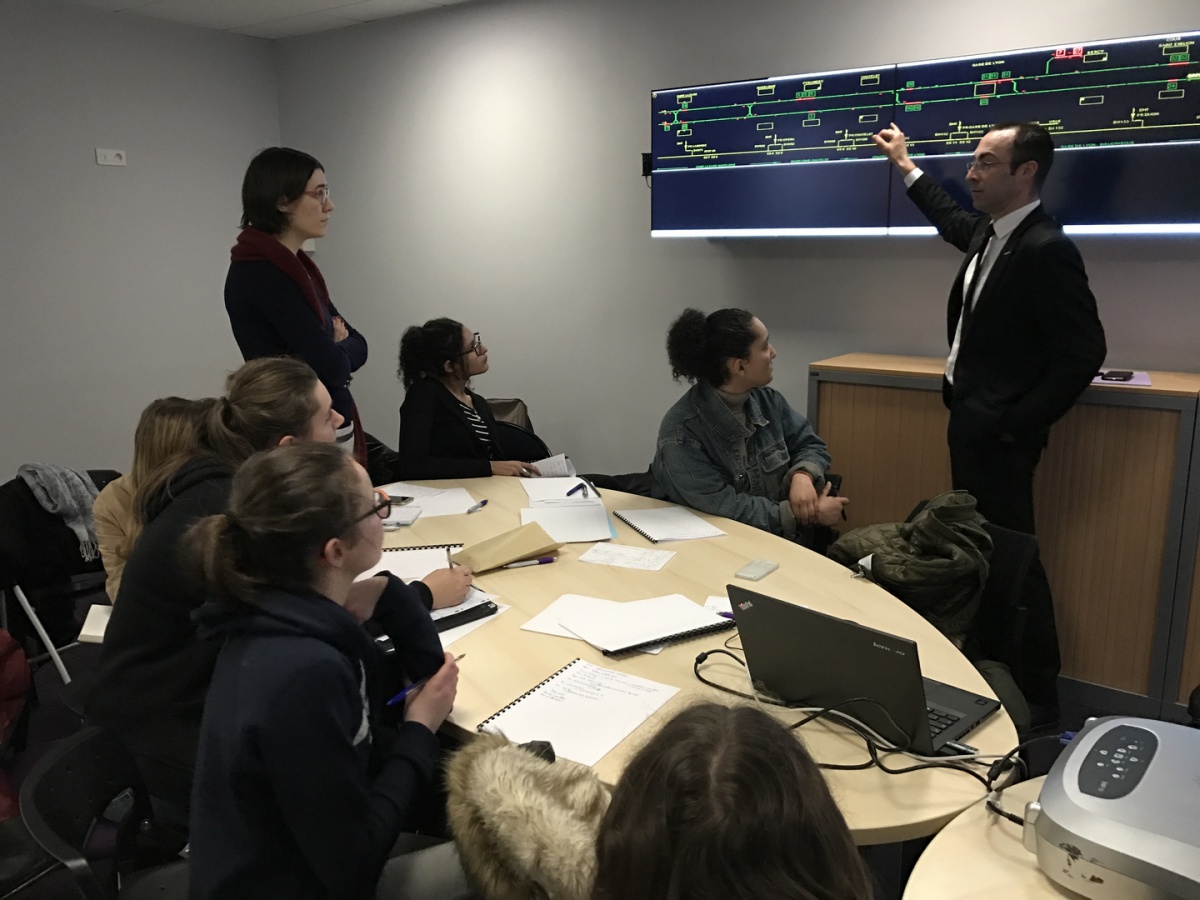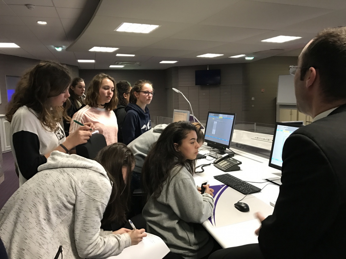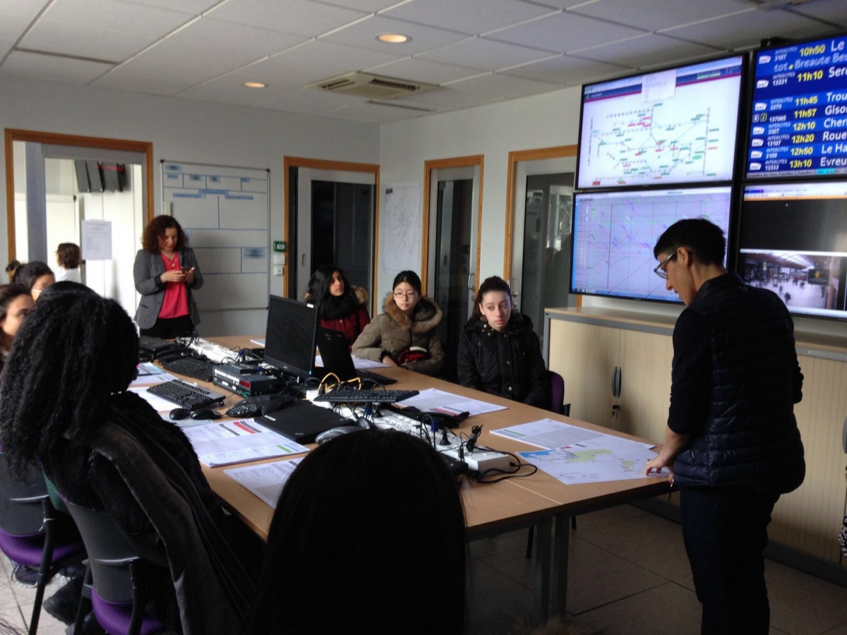 Dans la salle de crise, les collégiennes de l'établissement Elsa Triolet à Saint-Denis (93) a d'abord écouté les explications du fonctionnement des Circulations Ferroviaires. Que se passe-t-il en cas d'incidents ? Puis, elles ont découvert les métiers GTI (Gestionnaire Transports et Informations), qui consistent à gérer l'utilisation des moyens, réguler, mais aussi informer les voyageurs en cas d'incidents. Puis, en 3 groupes, elles ont visité la salle opérationnelle ouverte 24/24 et 7j/7 avec l'explication des différents métiers face aux multiples écrans.