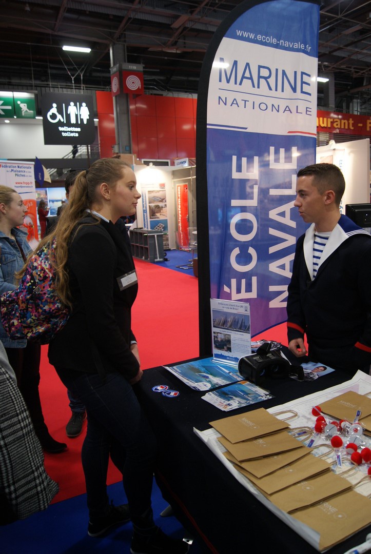 13h-15h : CNB, Yachts, Fountain Pajot, Garmin, Jeanneau, NKE, Plastimo, Watt&Sea, Marine Nationale… Les groupes se succèdent sur les stands des entreprises partenaires de l'événement. Les collégiennes, lycéennes et étudiantes écoutent avec attention les explications des professionnel.les du secteur du maritime et assistent à des démonstrations.