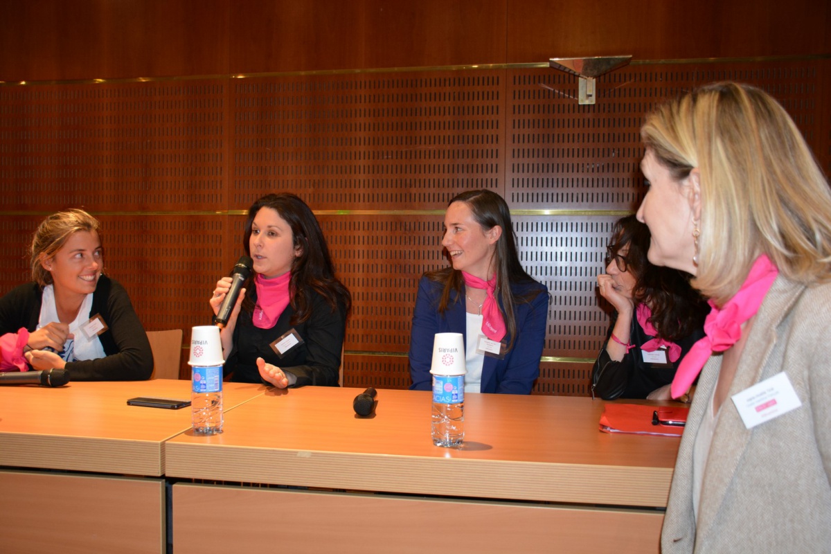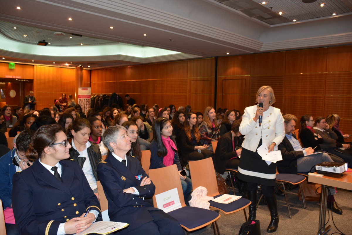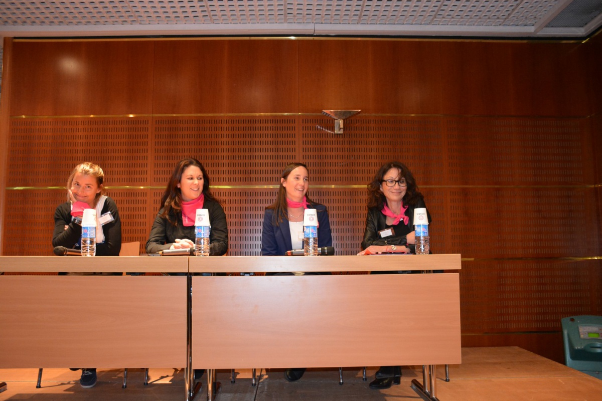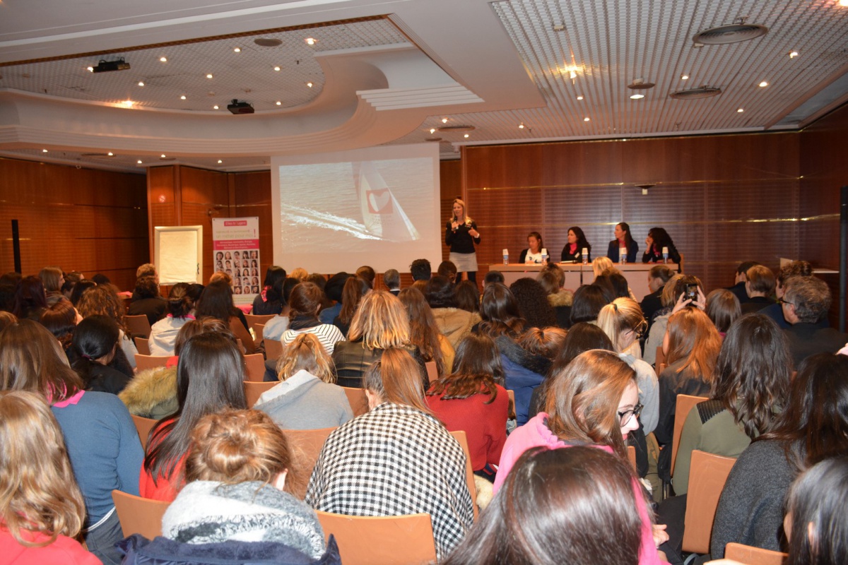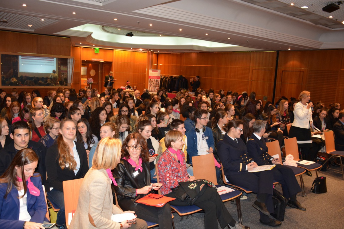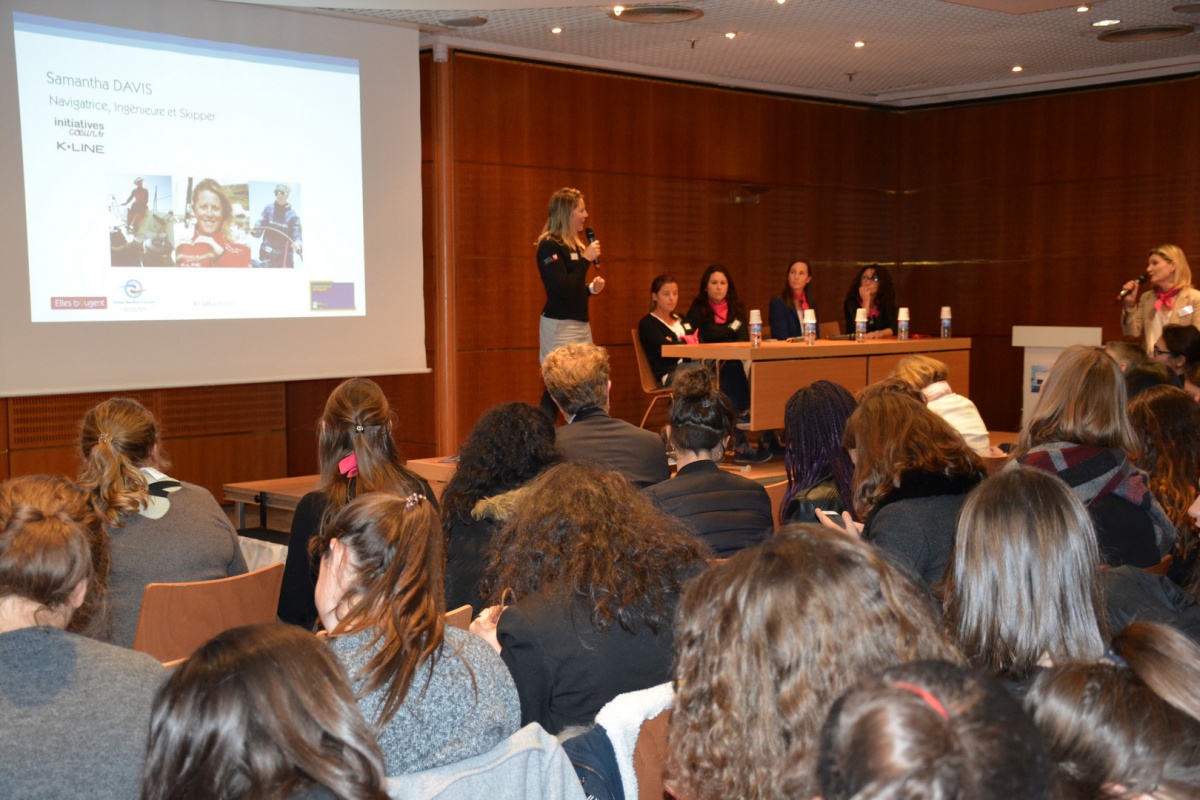 15h45 : Après la traditionnelle photo de groupe avec l'ensemble des 175 participantes, munies de leurs sacs et foulards roses, la conférence sur les métiers du maritime au féminin peut commencer.