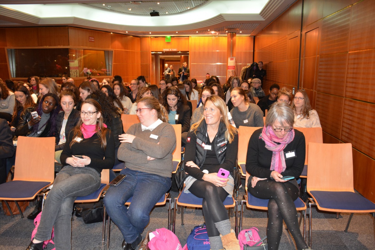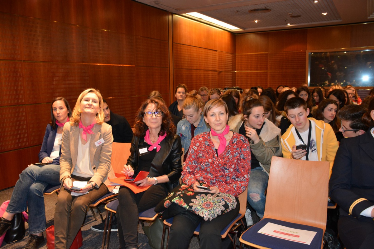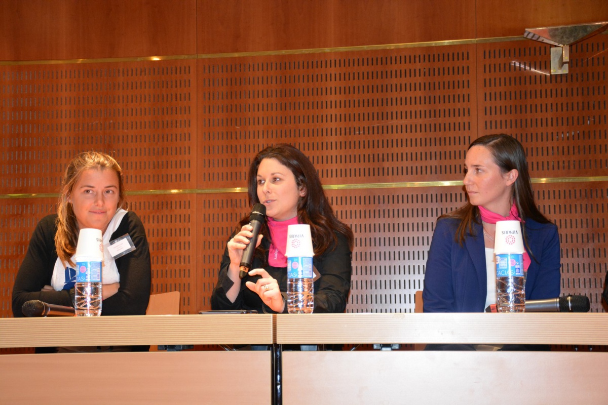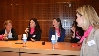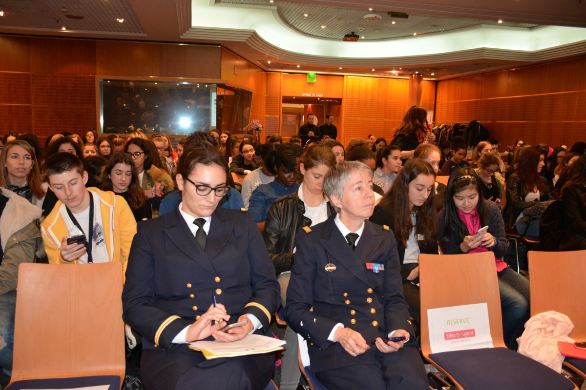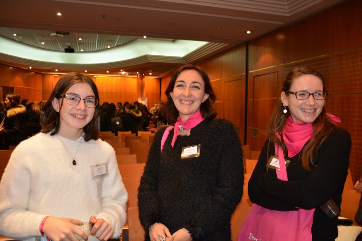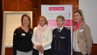 15h45 : Après la traditionnelle photo de groupe avec l'ensemble des 175 participantes, munies de leurs sacs et foulards roses, la conférence sur les métiers du maritime au féminin peut commencer.