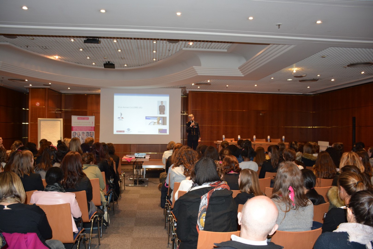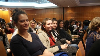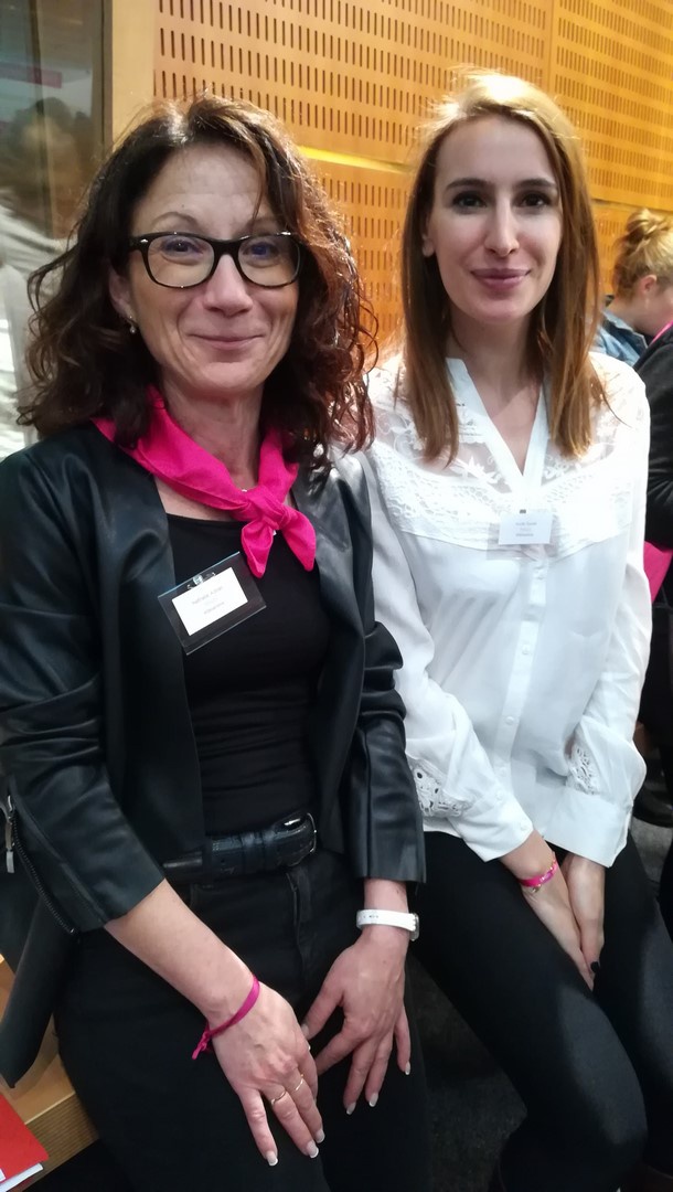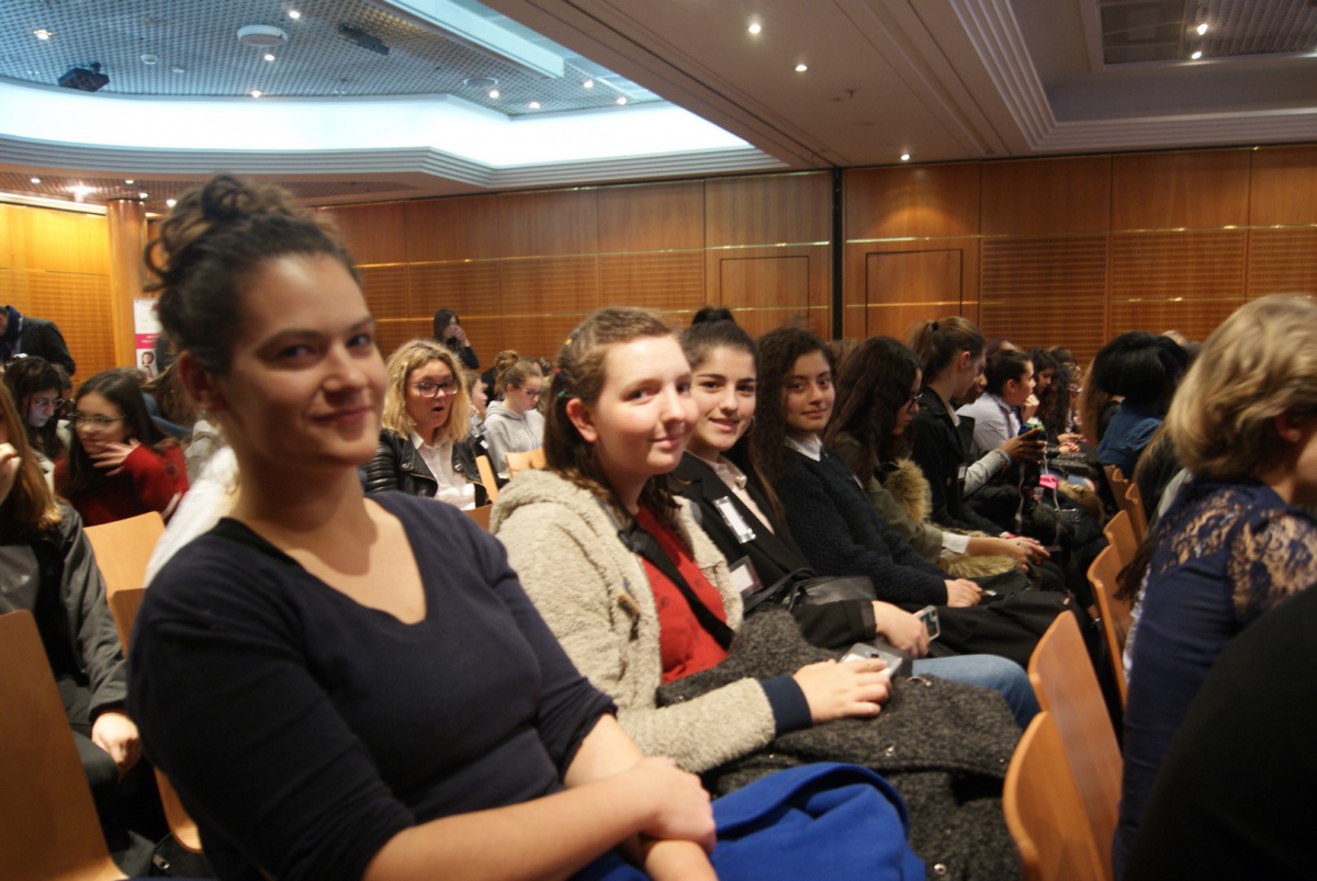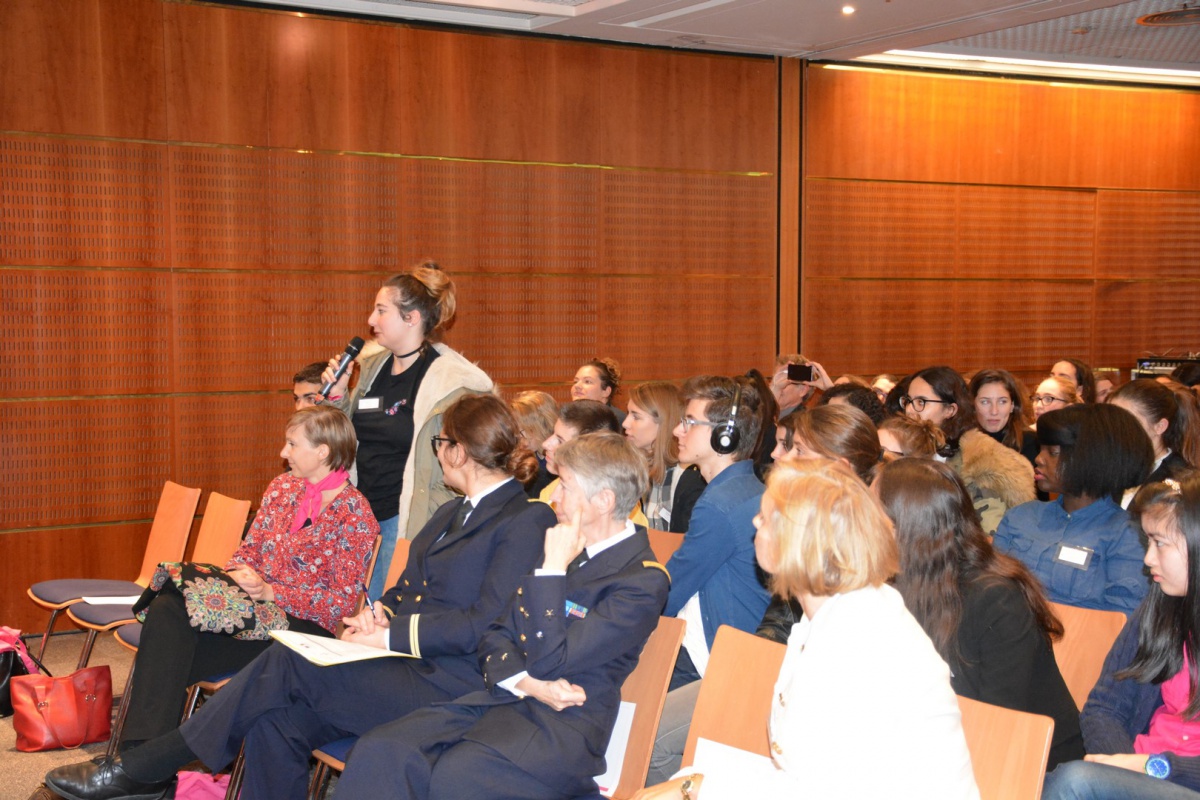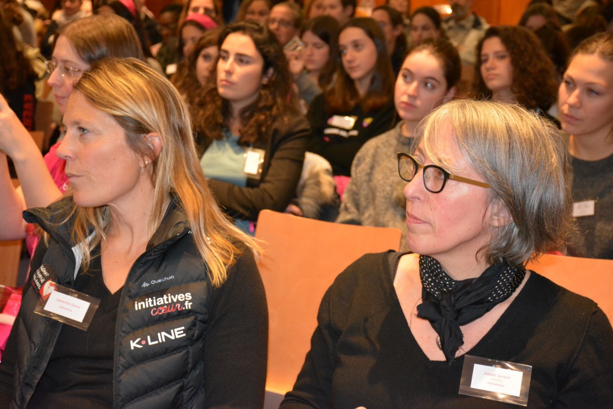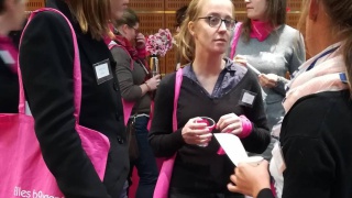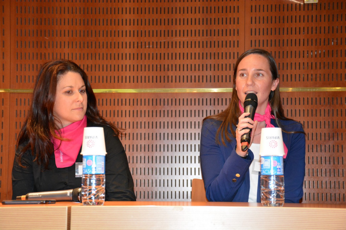 15h45 : Après la traditionnelle photo de groupe avec l'ensemble des 175 participantes, munies de leurs sacs et foulards roses, la conférence sur les métiers du maritime au féminin peut commencer.