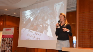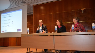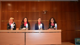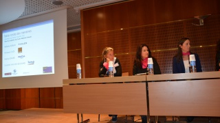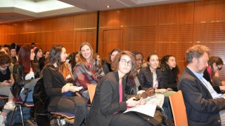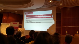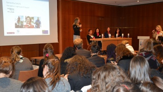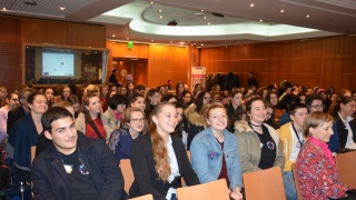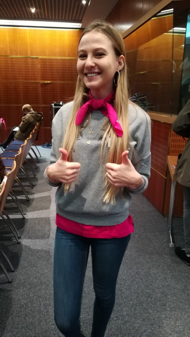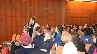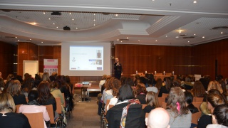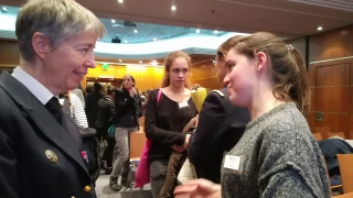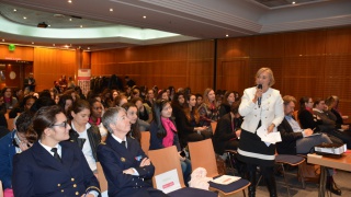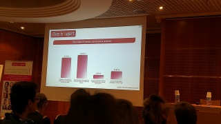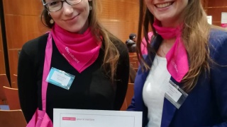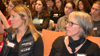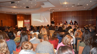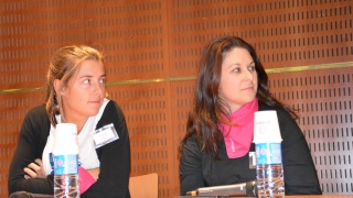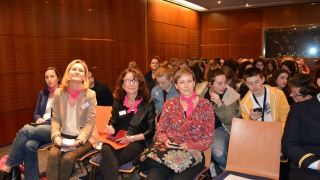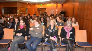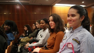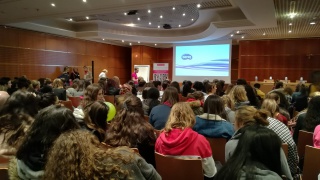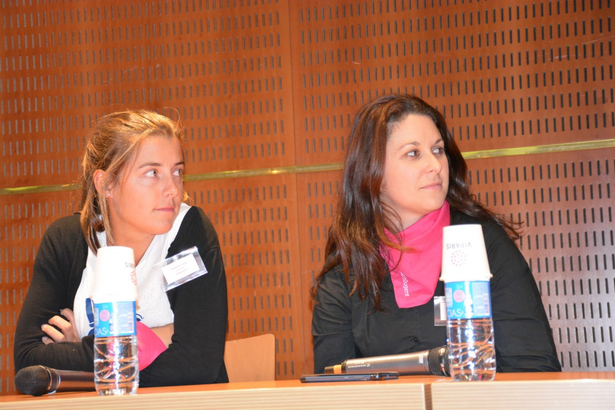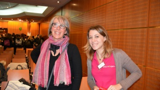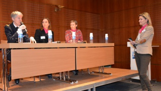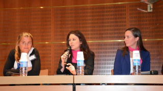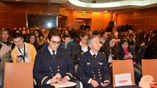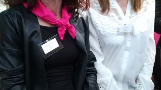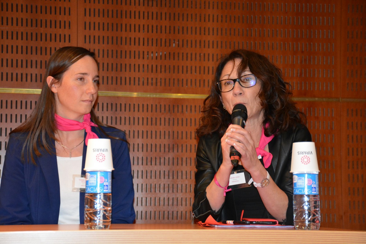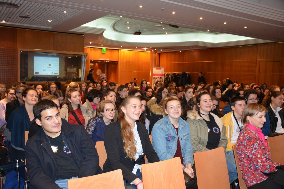15h45 : Après la traditionnelle photo de groupe avec l'ensemble des 175 participantes, munies de leurs sacs et foulards roses, la conférence sur les métiers du maritime au féminin peut commencer.
