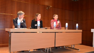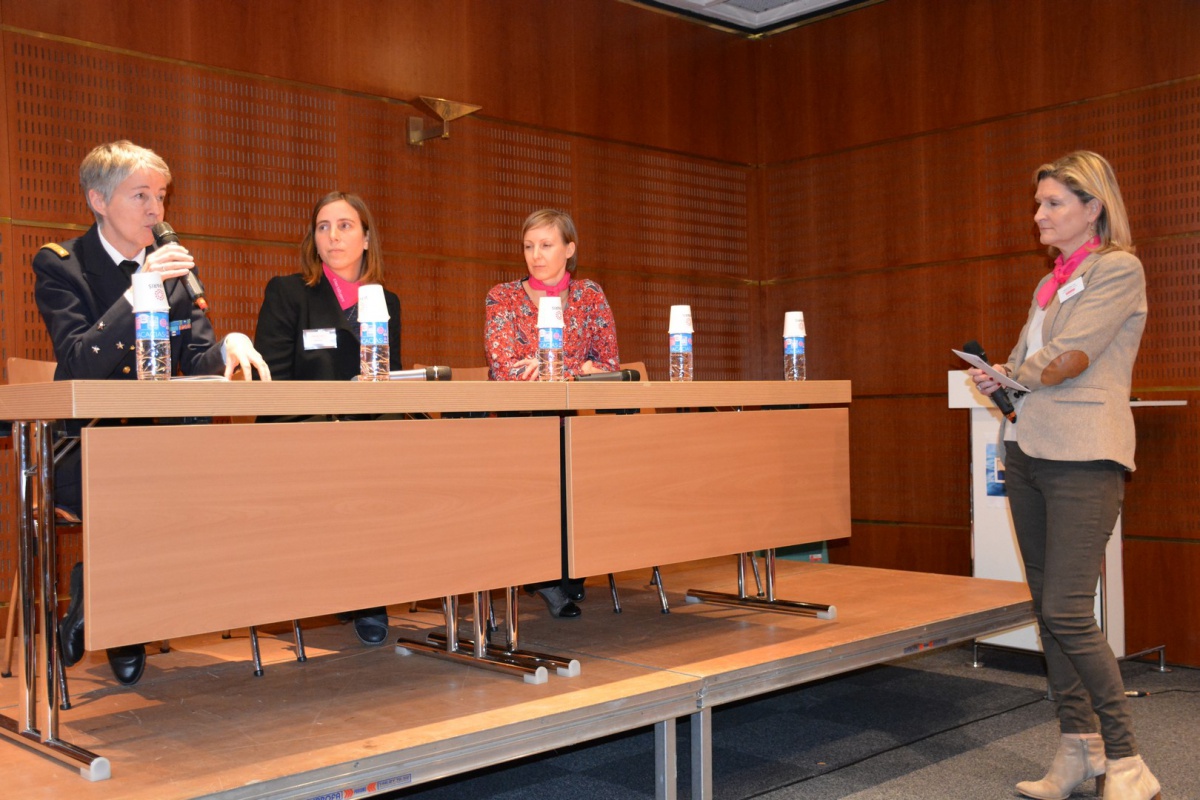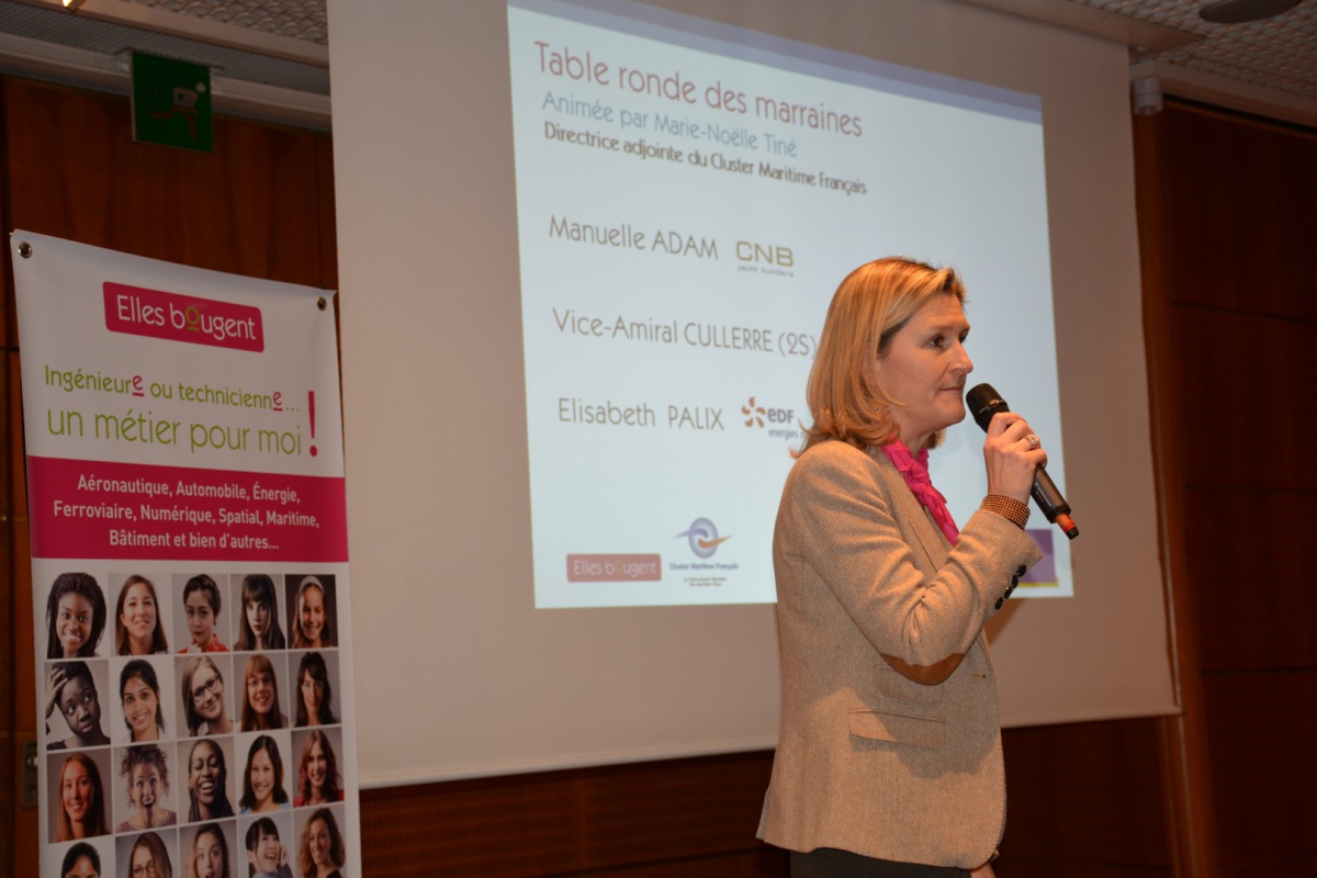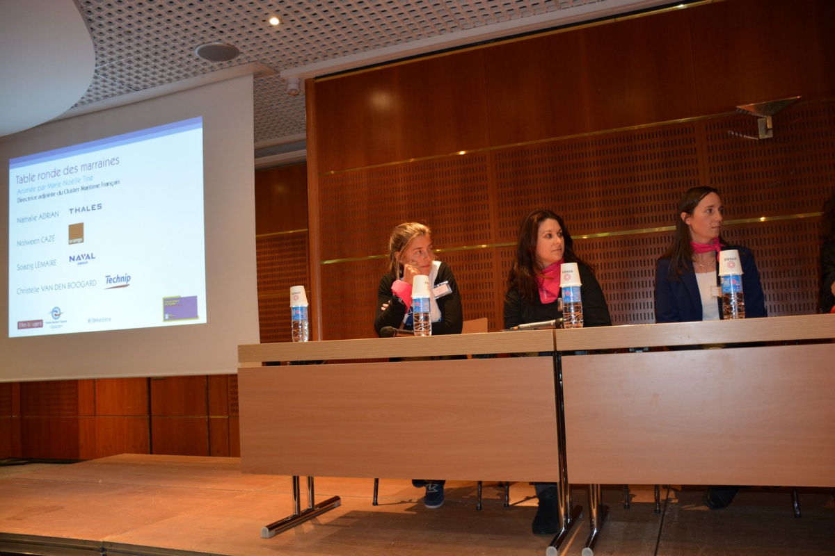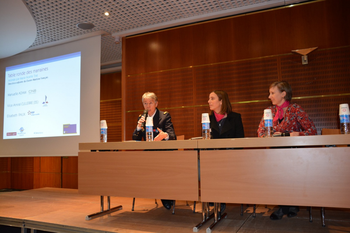 16h10 : Place à la première table ronde des marraines avec Manuelle Adam du CNB Yachts, la vice-amiral Cullerre et Elisabeth Palix d'EDF Energies Nouvelles, animée par la Directrice adjointe du Cluster Maritime, Marie-Noëlle Tiné.