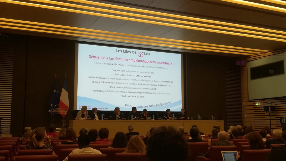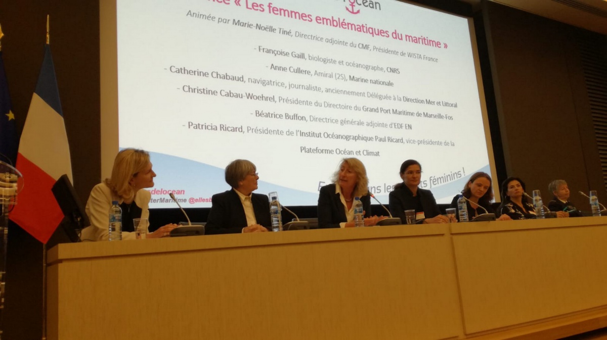 Véritables Role Models du maritime au féminin, Françoise Gaill, biologiste et océanographe du CNRS, Anne Cullerre, Amiral de la Marine Nationale, Catherine Chabaud, navigatrice et journaliste, Christine Cabau-Woehrel, Présidente du Directoire du Grand Port de Marseille-Fos, Béatrice Buffon, Directrice adjointe d'EDF Energies Nouvelles, et Patricia Ricard, Présidente de l'Institut Océanographique Paul Ricard, ont témoigné de leur expérience professionnelle et délivré leurs conseils lors de cette grande conférence.
