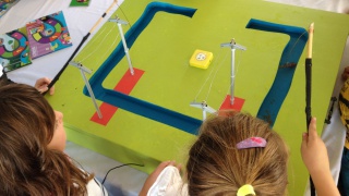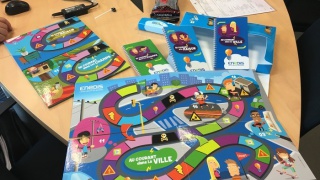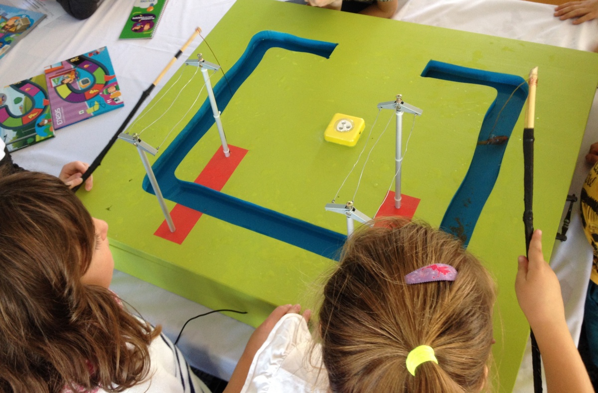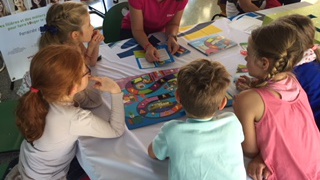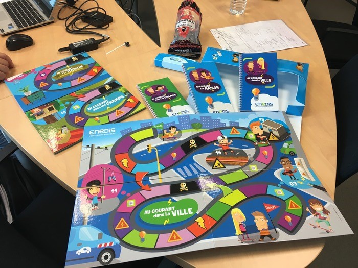 Dans cet atelier, les enfants jouent à un jeu de l'oie, dont ils ont choisi leur thématique (maison, ville ou champs) : en avançant un pion sur le plateau de jeu, ils apprennent tout sur l'électricité et comment agir avec elle dans la maison, dans la ville ou dans les champs.