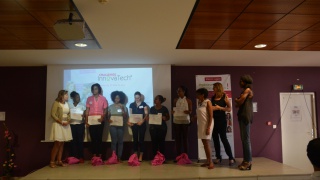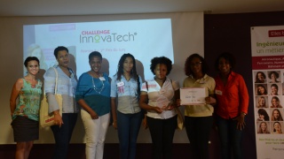 Le public s'est ensuite déchaîné lors des votes par sms ! Remis par Madame Marinette Torpille, le Prix Coup de Cœur du Public a été remis à l'équipe Verte pour le projet Renov'Eco, composée de Sandrine, marraine CTM, Raphaelle, Krystel et Aude, marraines EDF, Laetitia, étudiante en BTS au Lycée Bissol, Elice, étudiante en CPGE à Joseph Gaillard, Chloé et Aude, lycéennes au Lycée Le François.