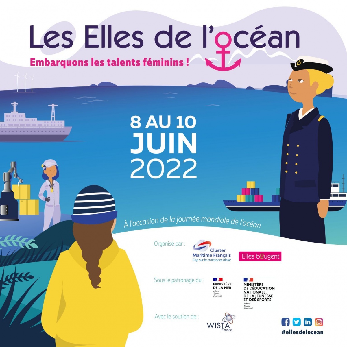 Les 8, 9 et 10 juin 2022 a eu lieu la 4ème édition des Elles des l'Océan à l'occasion de la journée mondiale des Océans. Elles Bougent est ravie d'avoir mobilisé 11 entreprises partenaires et membres du Cluster Maritimes Français pour mettre en avant les métiers de la mer et accueillir :