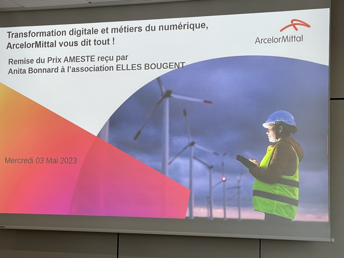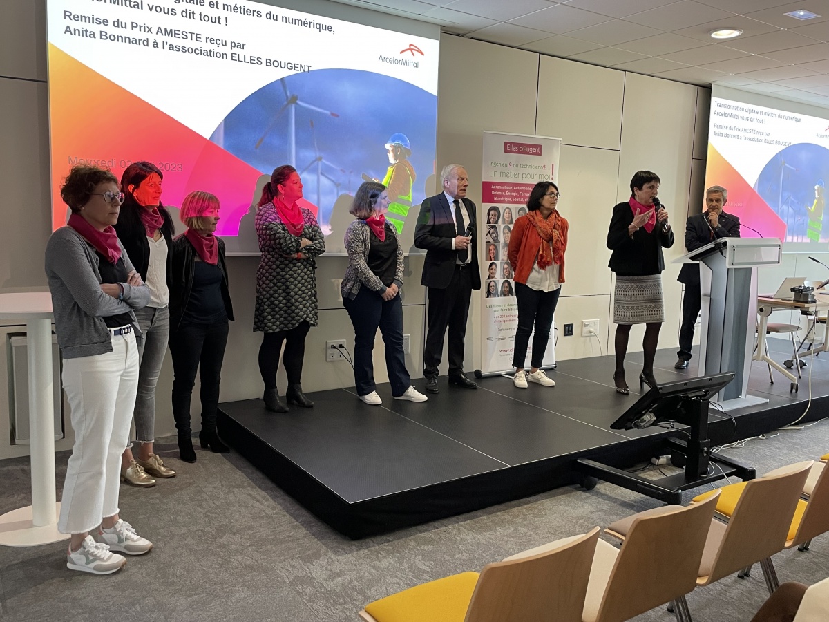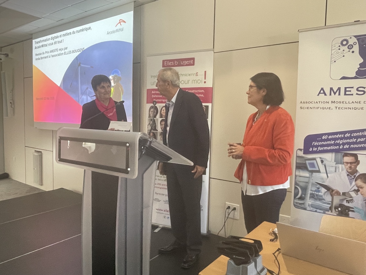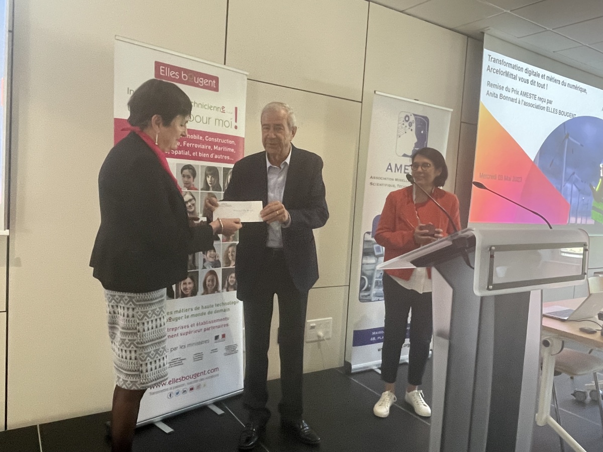 Mercredi 3 mai, avec Agnès Volpi, nous avons eu l'honneur de recevoir au nom de l'association Elles bougent un chèque de 3000€ offert par Anita Bonnard, ex COO Finishing de ArcelorMittal accompagnant le prix 2022 de l'association AMESTE qui lui a été remis pour l'ensemble de ses actions.