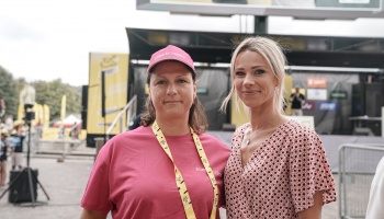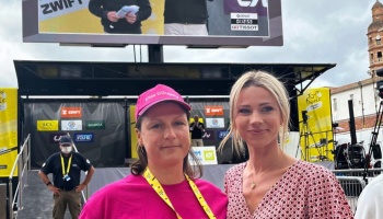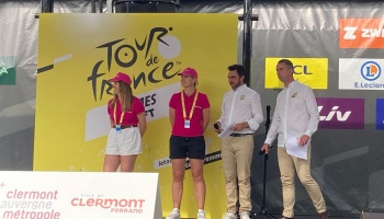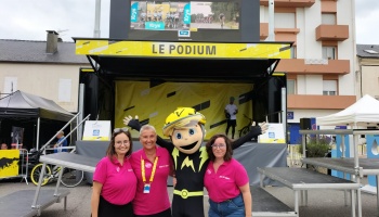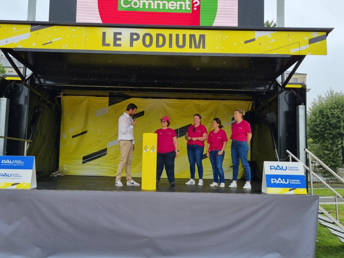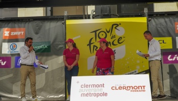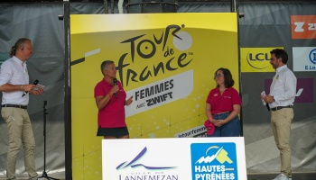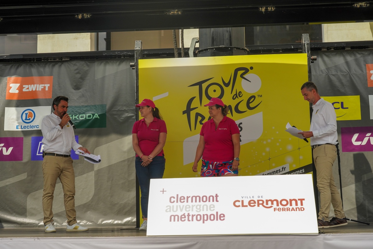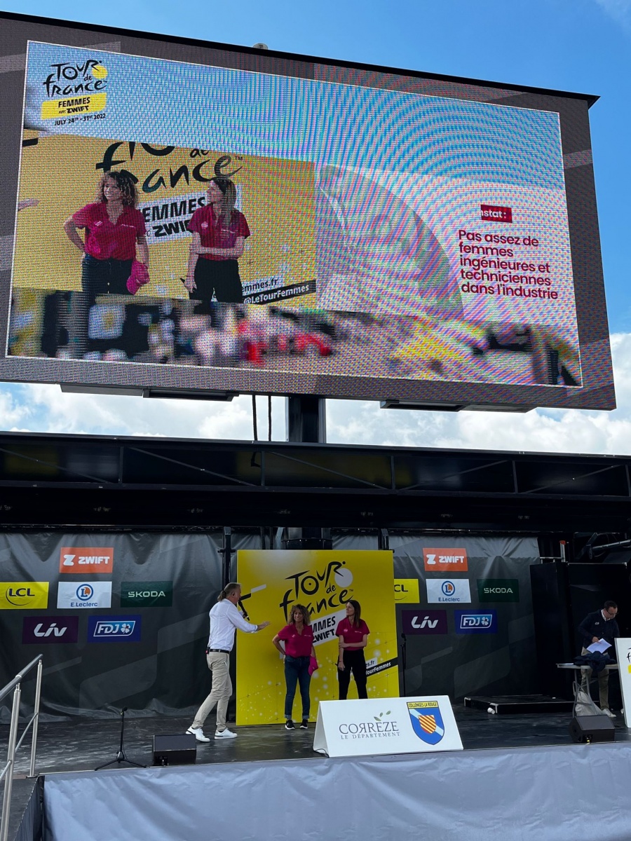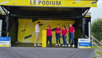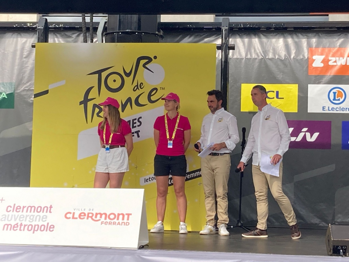 | Étape 5 : Onet-le-Château Les marraines Isabelle Valette, Eiffage, et Mélanie Valade, EDF, étaient présentes le 27 juillet sur le Podium dans la Fan Zone à Onet-le-Château. |