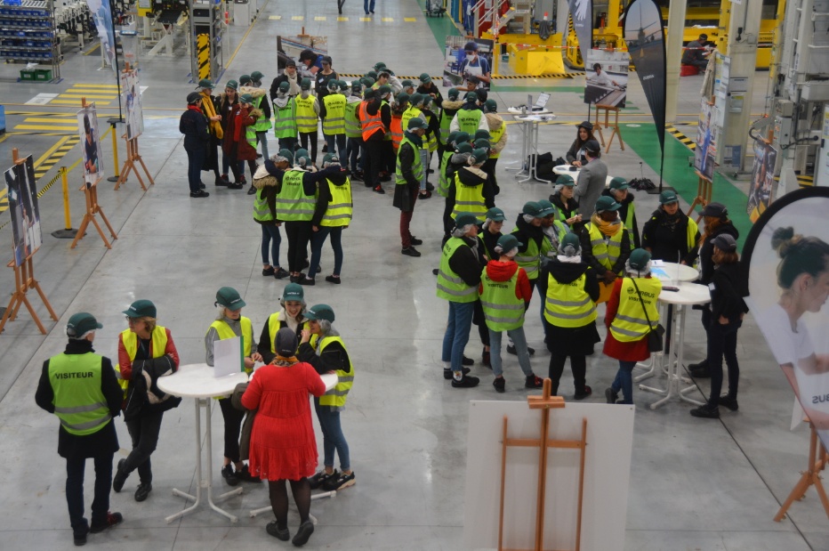 Réparties en quatre groupes, elles ont tout d'abord visité le bâtiment de production du caisson central de l'A350. Une dizaine d'employées d'Airbus les attendaient ensuite afin de présenter leurs métiers, les formations associées et leurs parcours parfois atypiques.